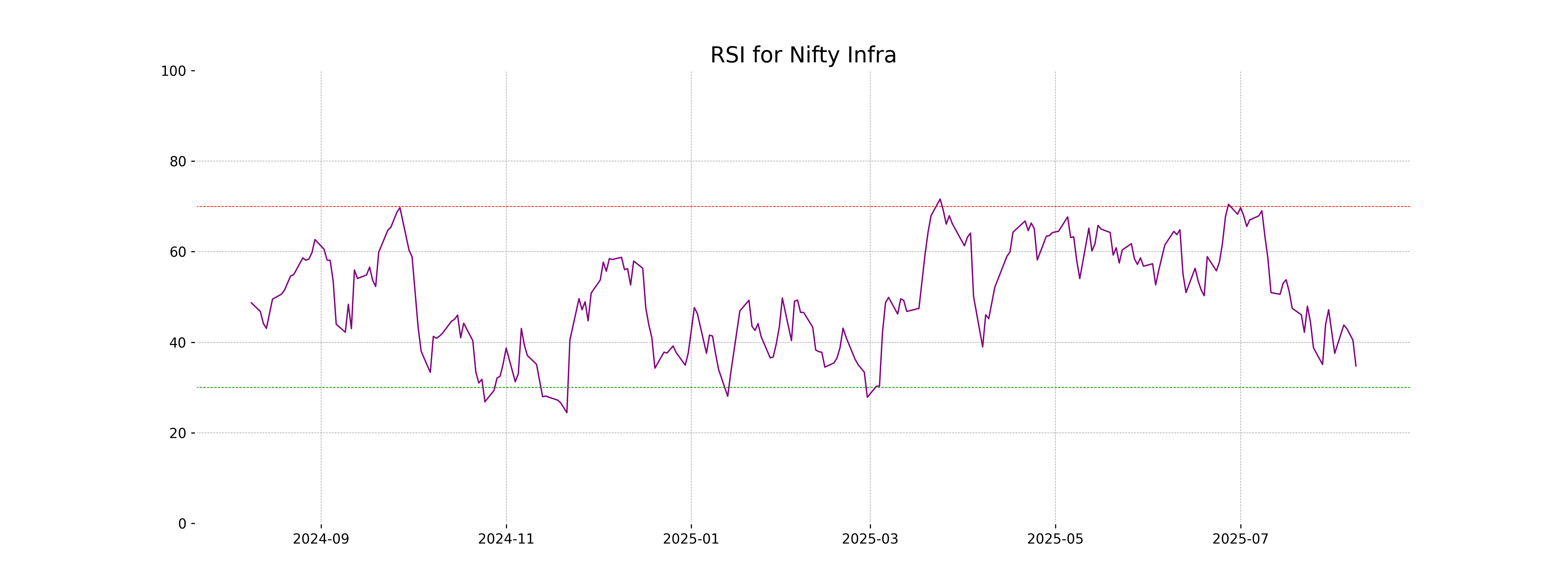 The RSI for Nifty Infra is 34.76, indicating that the stock is approaching oversold conditions. Generally, an RSI below 30 is considered oversold, suggesting potential for a price reversal. However, it's important to consider other technical indicators and market conditions before making any investment decisions.