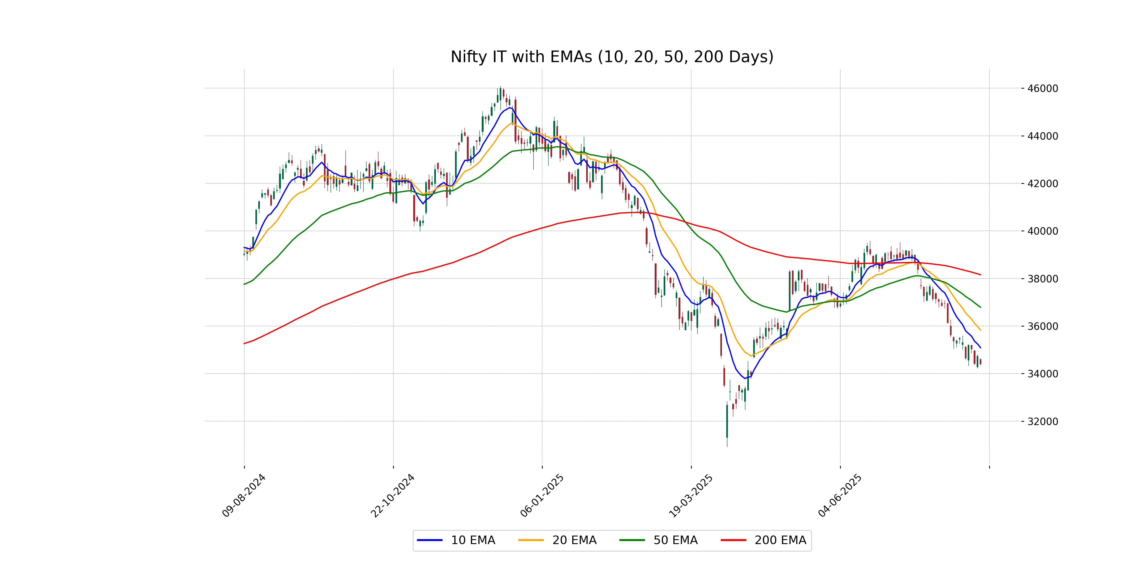 The Nifty IT index's current close of 34,398.5 is below all its key moving averages, including the 50 EMA at 36,790.95, the 200 EMA at 38,159.86, the 10 EMA at 35,092.88, and the 20 EMA at 35,830.98. This indicates a bearish trend, supported by an RSI of 28.49, suggesting the index is in the oversold territory.