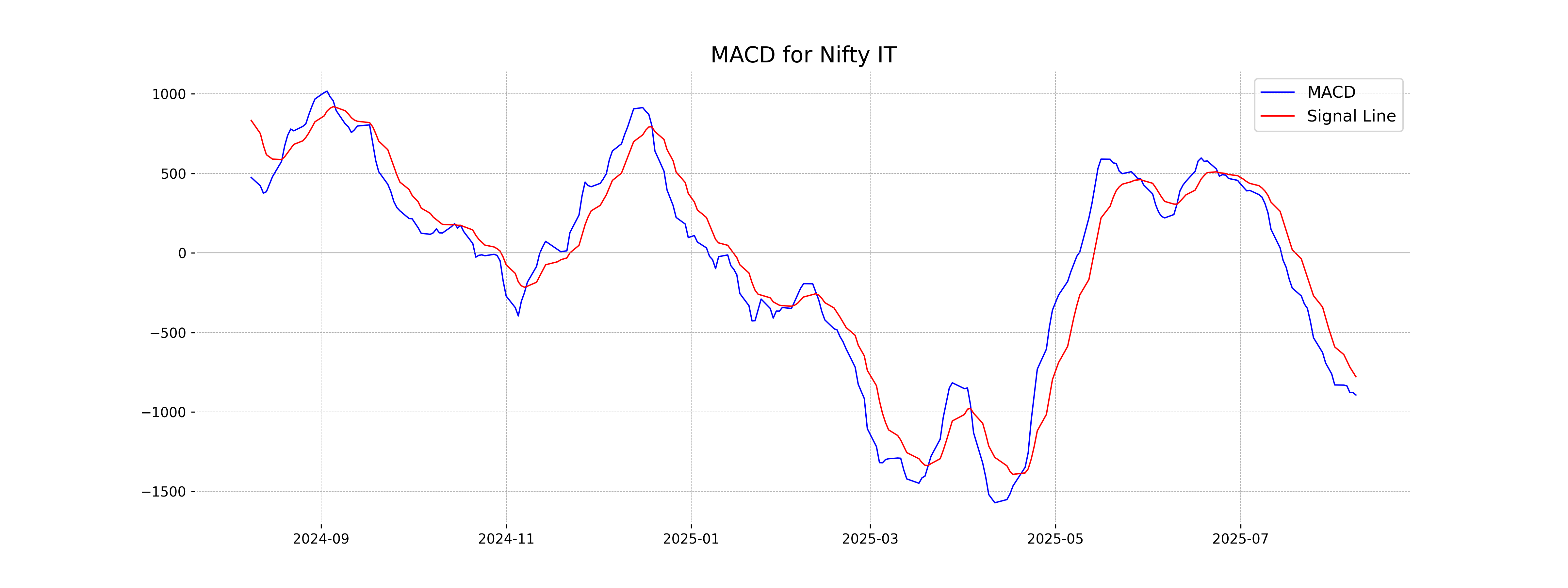 MACD Analysis for Nifty IT The MACD value of -893.81 compared with the MACD Signal Line at -779.20 suggests a bearish sentiment, with the increasing distance indicating a strong downward momentum. This aligns with the low RSI of 28.49, reflecting possible oversold conditions.