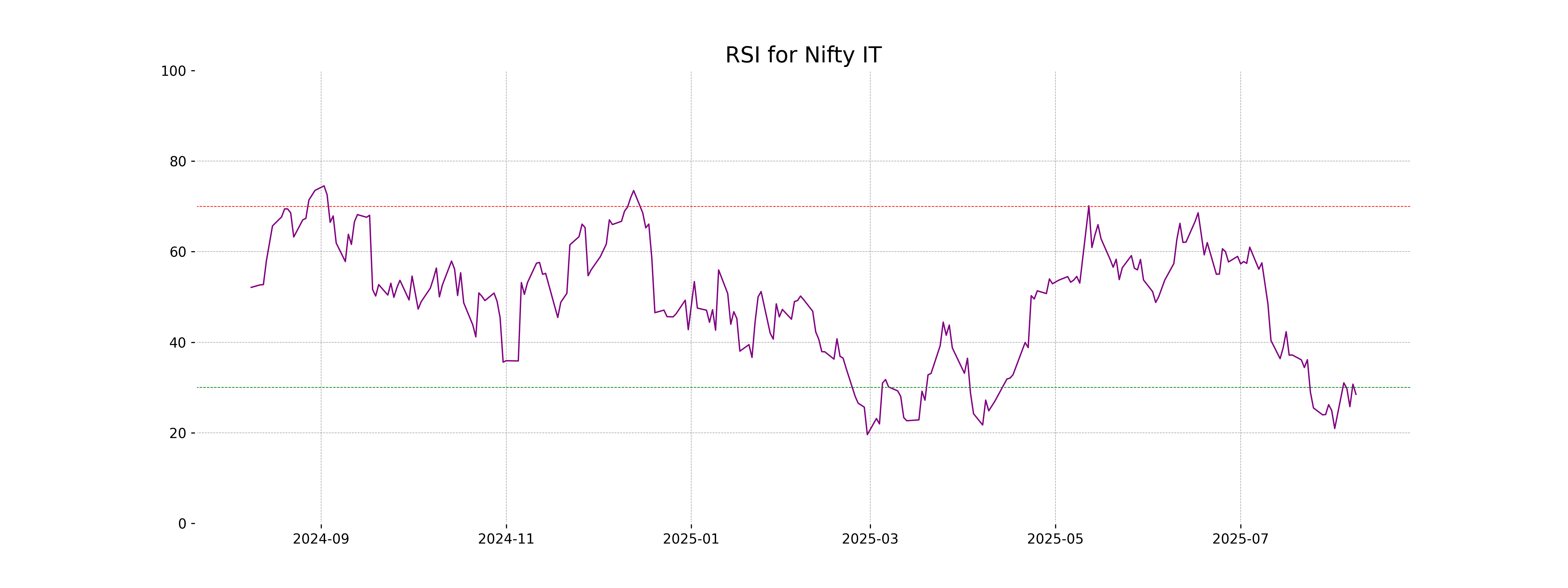 The RSI for Nifty IT is 28.49, indicating that the stock is in an oversold condition. This suggests potential for a reversal to the upside or a pause in the current downward trend. However, other indicators and market conditions should also be considered.