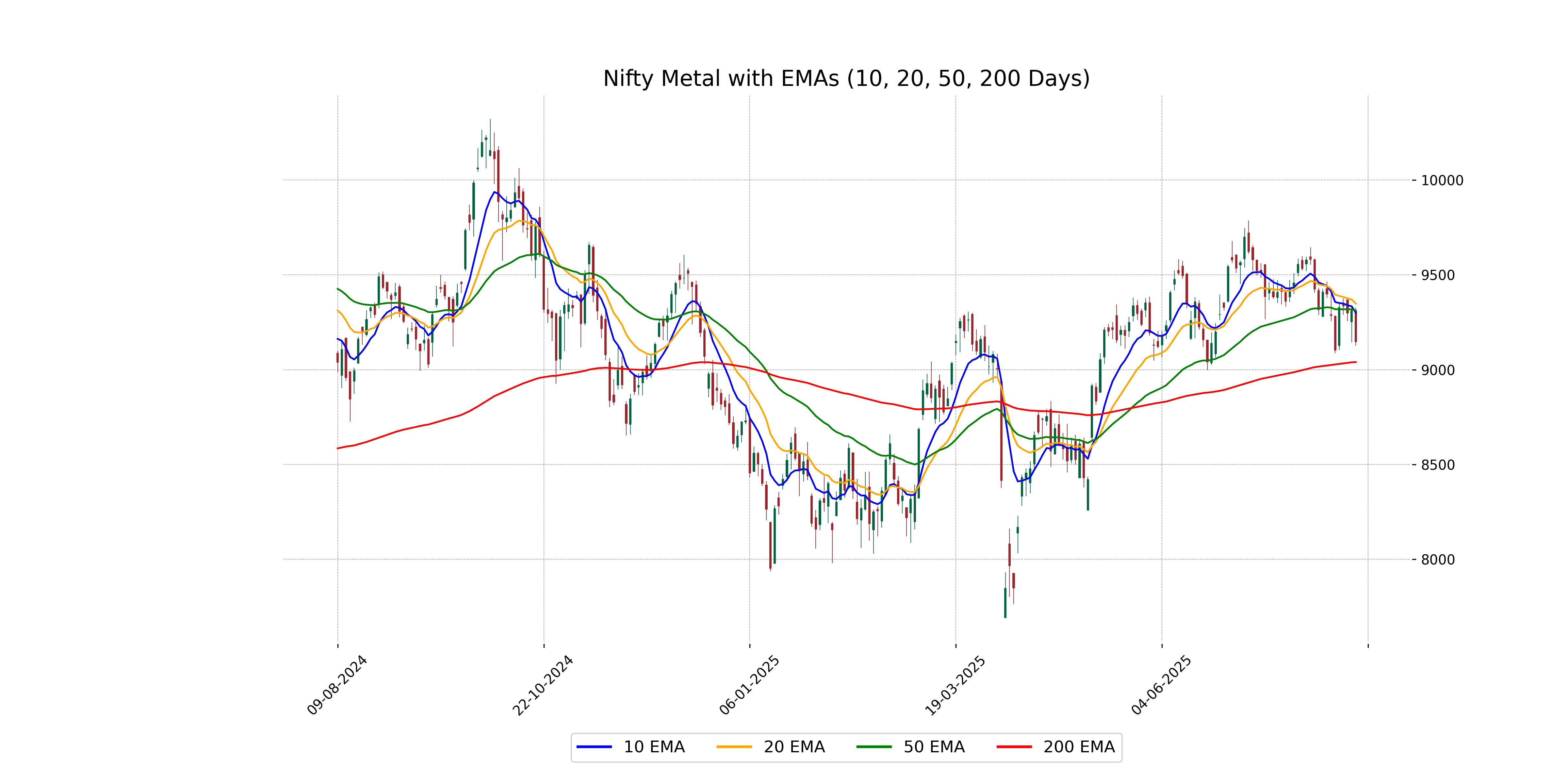 Nifty Metal closed below its 10-day, 20-day, and 50-day EMA, indicating a short-term bearish trend. Its closing price of 9147.10 is significantly lower than the key EMAs (10-day EMA: 9300.25, 20-day EMA: 9348.54, 50-day EMA: 9311.70), suggesting downward pressure. The 200-day EMA is at 9039.88, providing a longer-term support level.