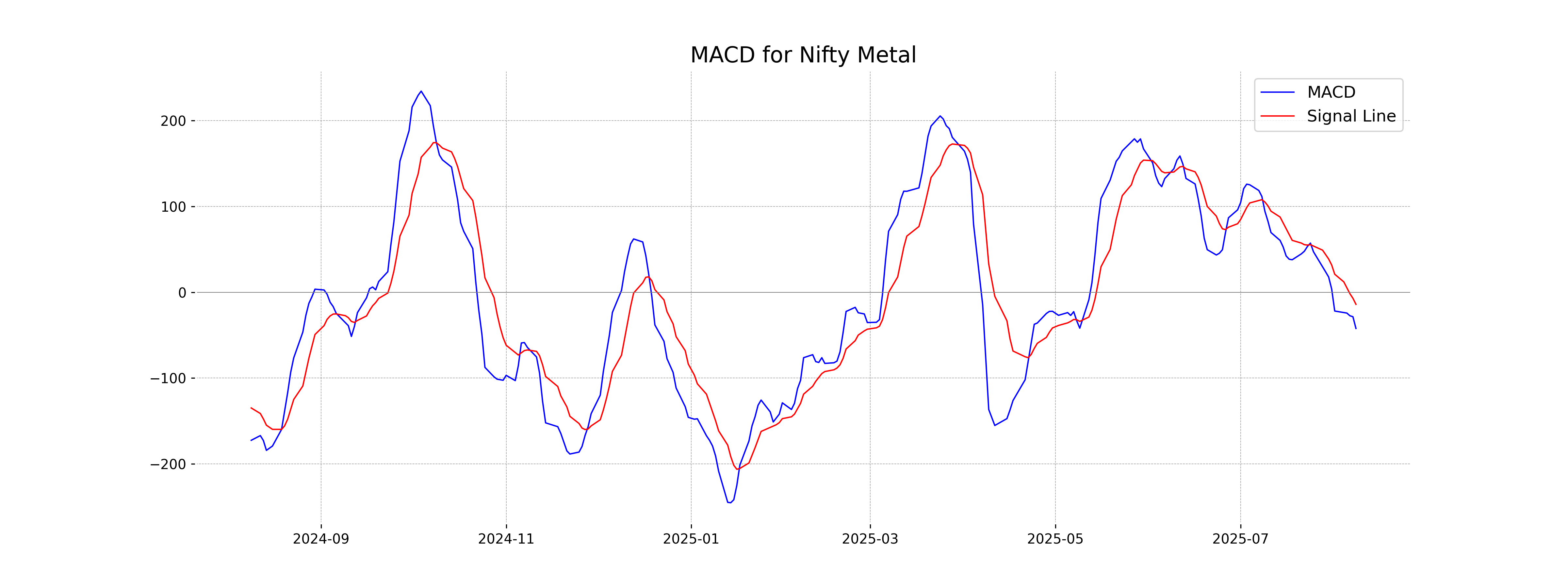 The MACD for Nifty Metal is at -42.14, which is below the MACD signal line at -14.00, indicating a bearish trend. The negative MACD value suggests that the stock is experiencing downward momentum.