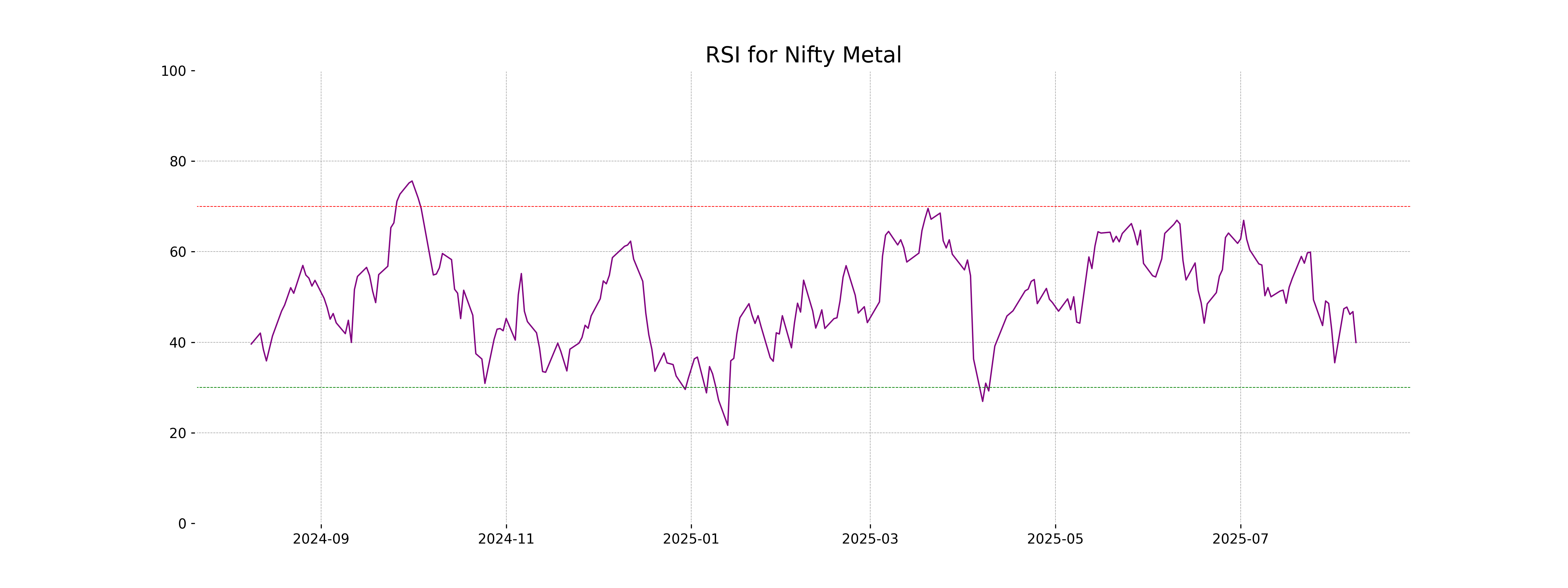 Nifty Metal RSI Analysis: The Relative Strength Index (RSI) for Nifty Metal stands at 39.94, indicating that the stock is approaching oversold territory. This level suggests that the stock may be undervalued and could experience a potential reversal or upward movement if the downward trend continues.