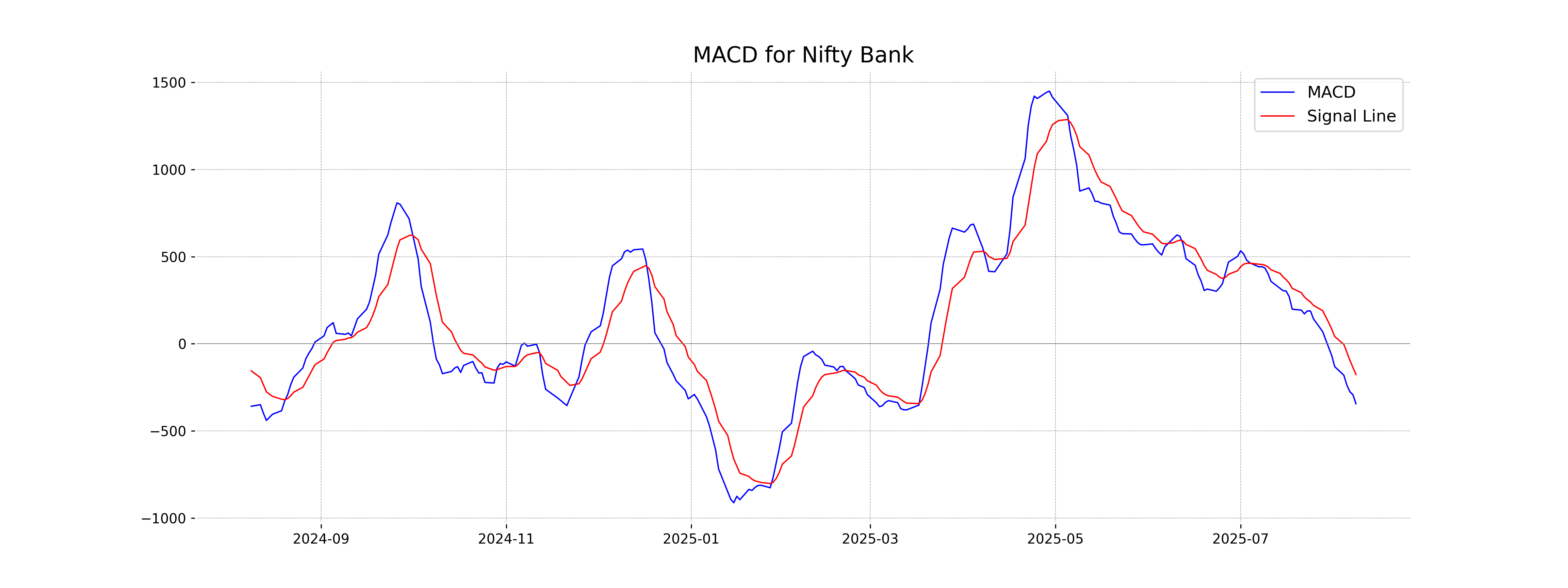 MACD Analysis for Nifty Bank: The MACD value is -344.04, and the MACD Signal is -176.17, indicating a bearish trend as the MACD is below the signal line. This suggests that the momentum may be shifting downwards.