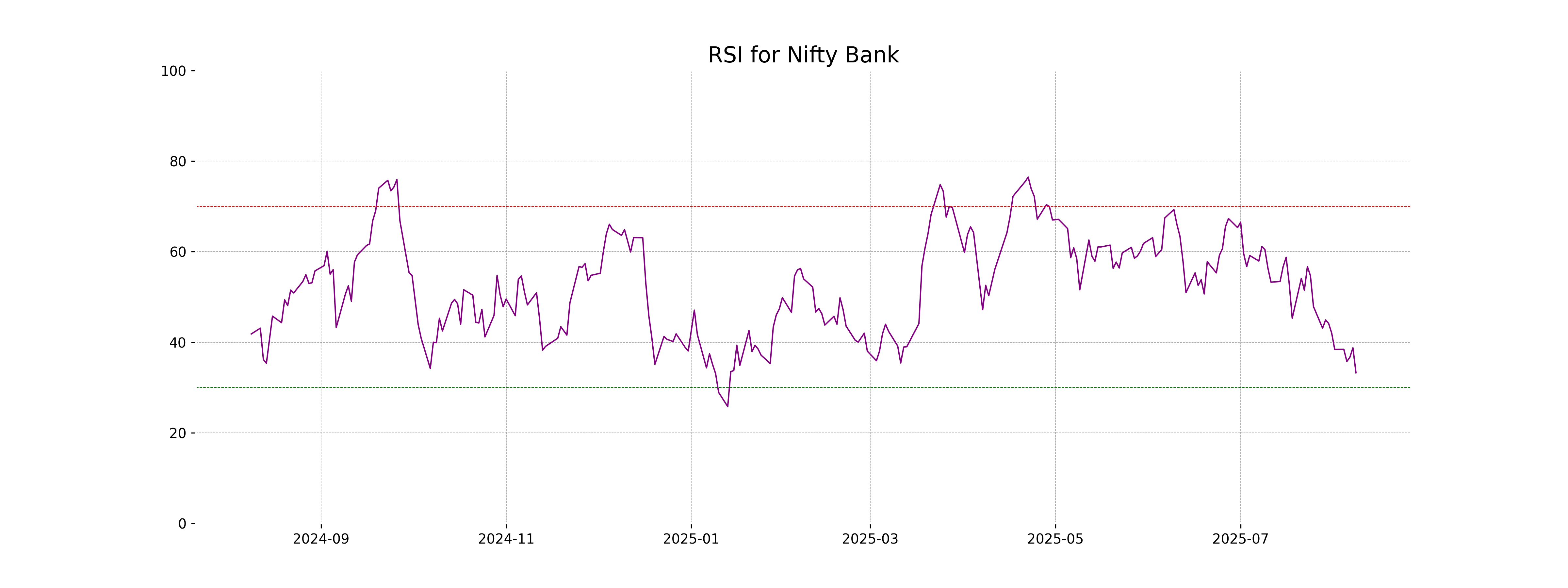 The RSI for Nifty Bank is currently at 33.25, which suggests that the stock is approaching the oversold territory. This could indicate potential for a reversal or consolidation in the near term, but caution is advised as it remains close to oversold conditions.