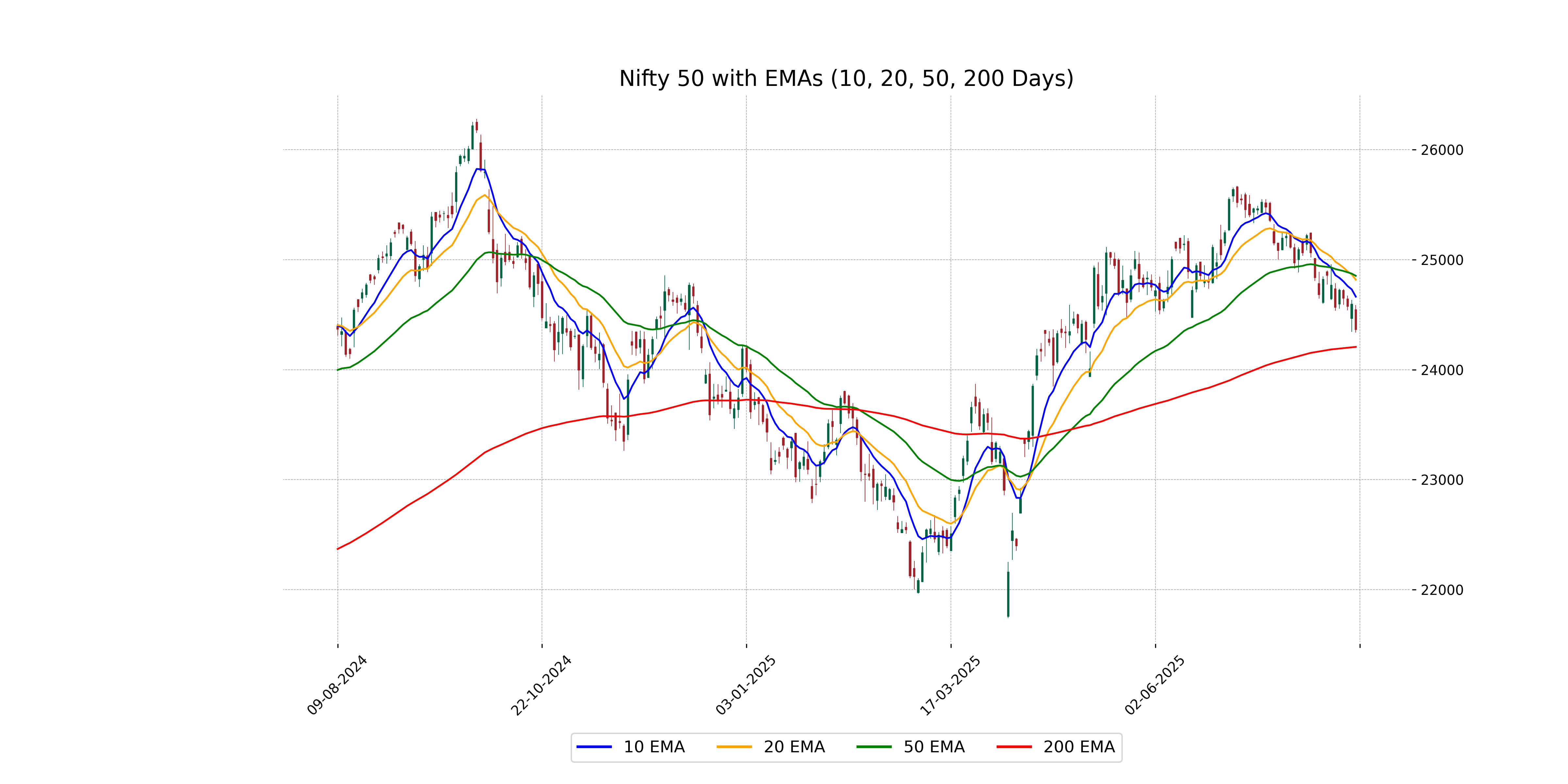 The closing price of Nifty 50 at 24,363.30 is below its 50 EMA (24,852.50) and 10 EMA (24,663.01), indicating a bearish trend in the short term. However, it remains above the 200 EMA (24,206.73), suggesting that the longer-term trend may still be supported.