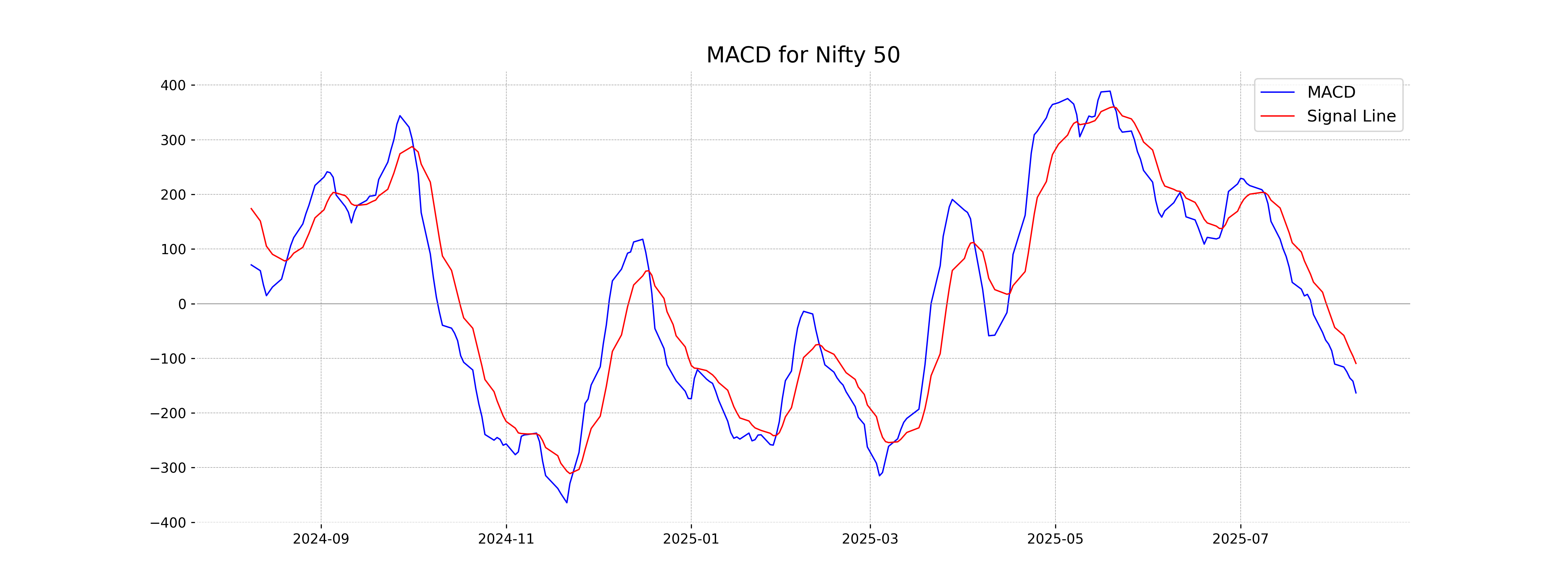 The MACD analysis for Nifty 50 indicates a bearish trend as the MACD value of -163.30 is below the MACD Signal of -109.38. This suggests that downward momentum is strengthening. Investors might interpret this as a potential signal for caution regarding further declines.