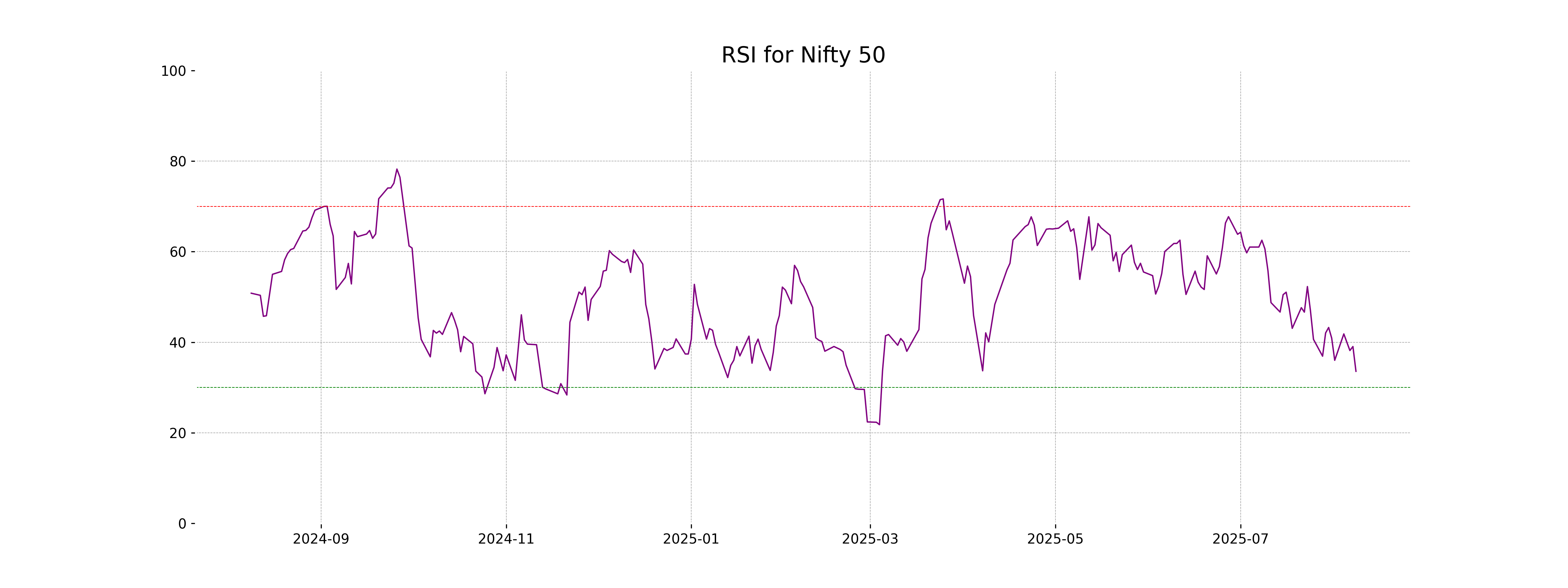 The Relative Strength Index (RSI) for Nifty 50 is 33.58, which is below the commonly used 30 threshold that suggests the index might be nearing oversold conditions. This indicates potential bearish sentiment, as values below 30 typically signal that the security is oversold, suggesting a possible buying opportunity.