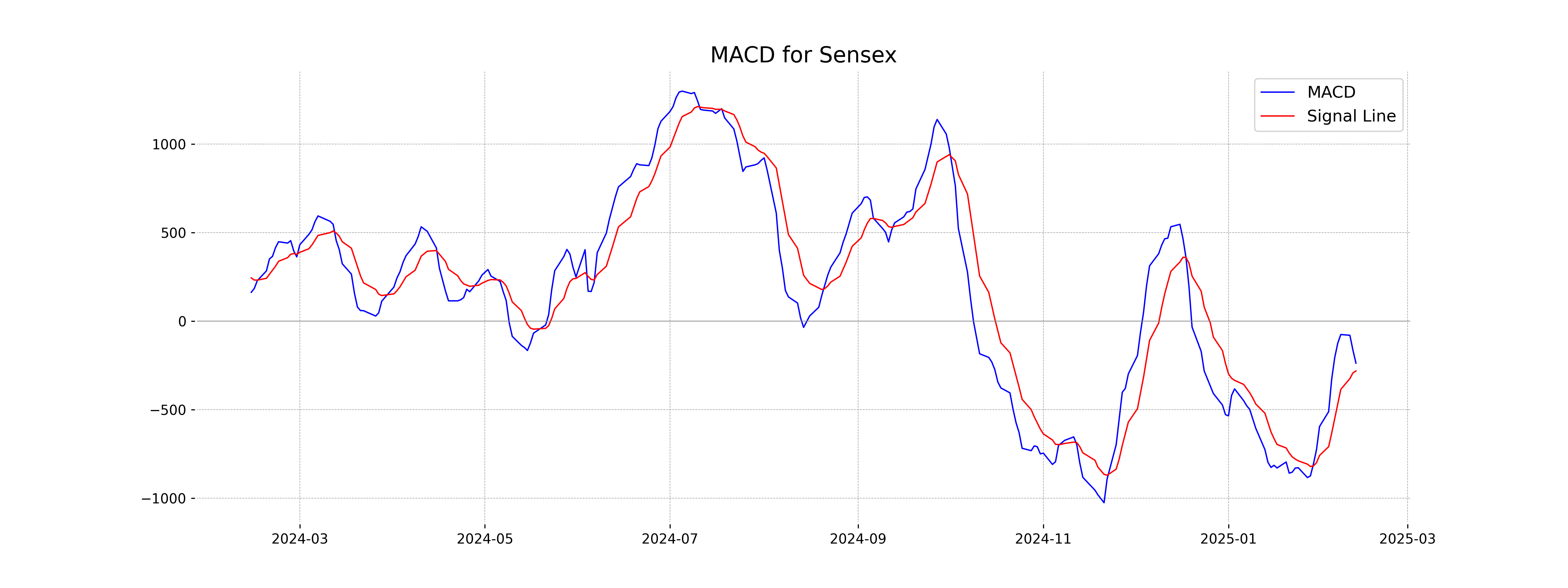 **Sensex MACD Analysis**: The MACD value for Sensex is -237.49, indicating a bearish momentum as it is below the MACD Signal line of -281.42. This negative divergence suggests a potential for continued downward movement in the near term.