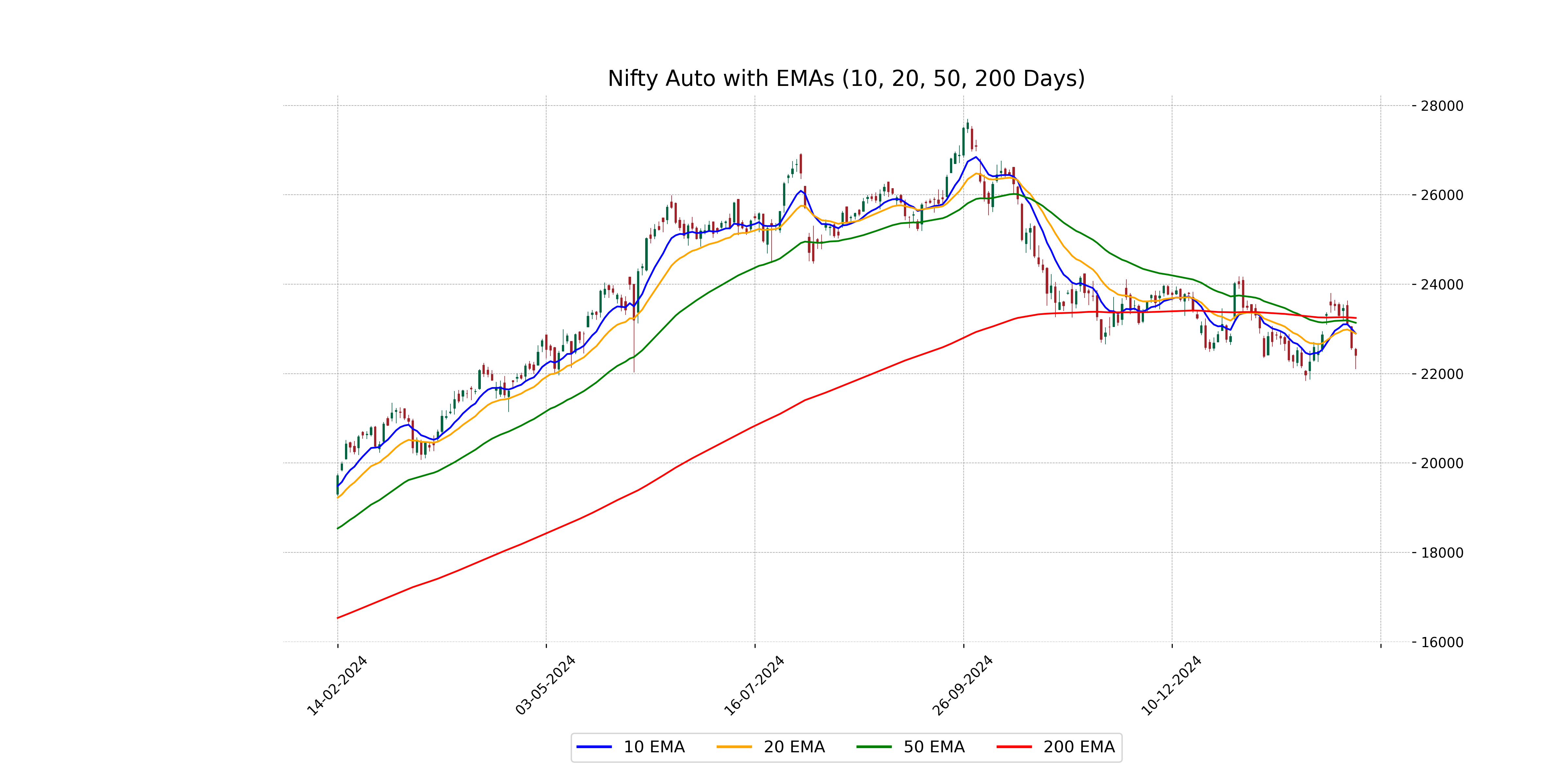 The closing price of Nifty Auto at 22407.45 is below its 10-day EMA of 22898.09, 20-day EMA of 22895.88, 50-day EMA of 23137.98, and 200-day EMA of 23245.88. This suggests a bearish trend in the short-term and long-term perspectives, as the index is trading below these key moving averages.