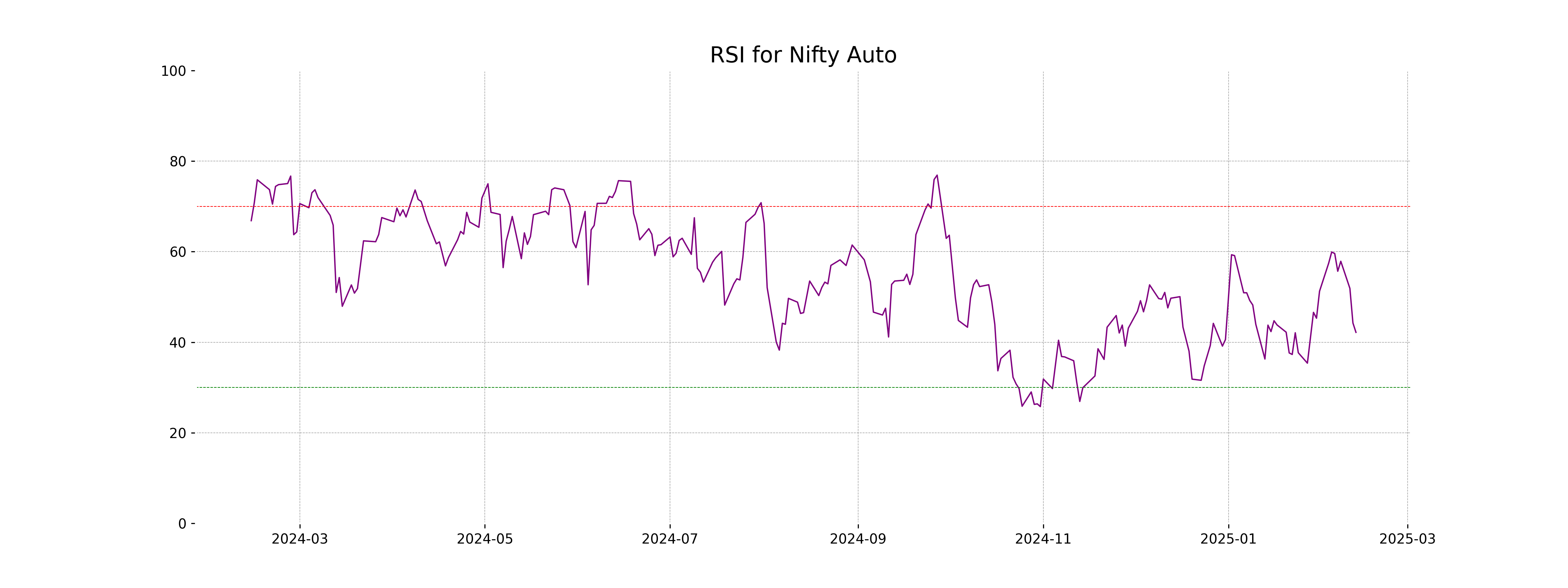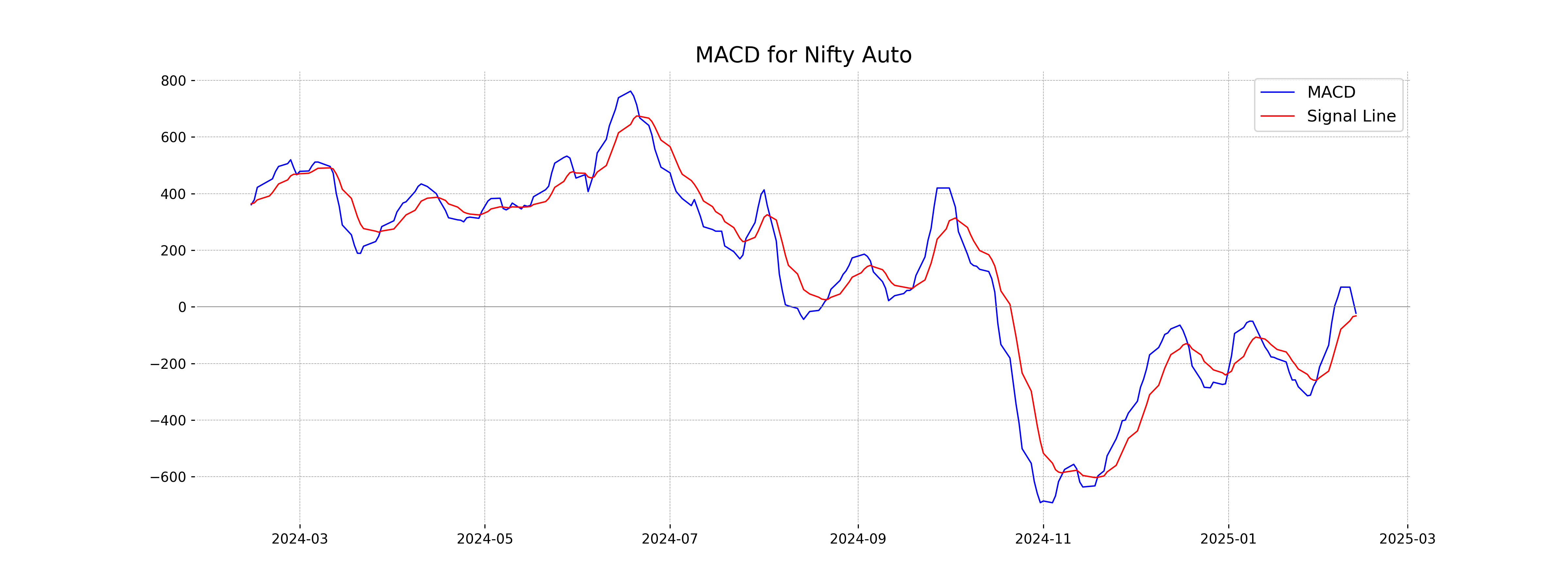 The RSI for Nifty Auto is 42.18, which typically indicates that the stock is neither overbought nor oversold. An RSI below 30 usually suggests an undervalued condition, while above 70 indicates overvaluation. Therefore, Nifty Auto appears to be in a neutral zone, pointing towards a balanced momentum.