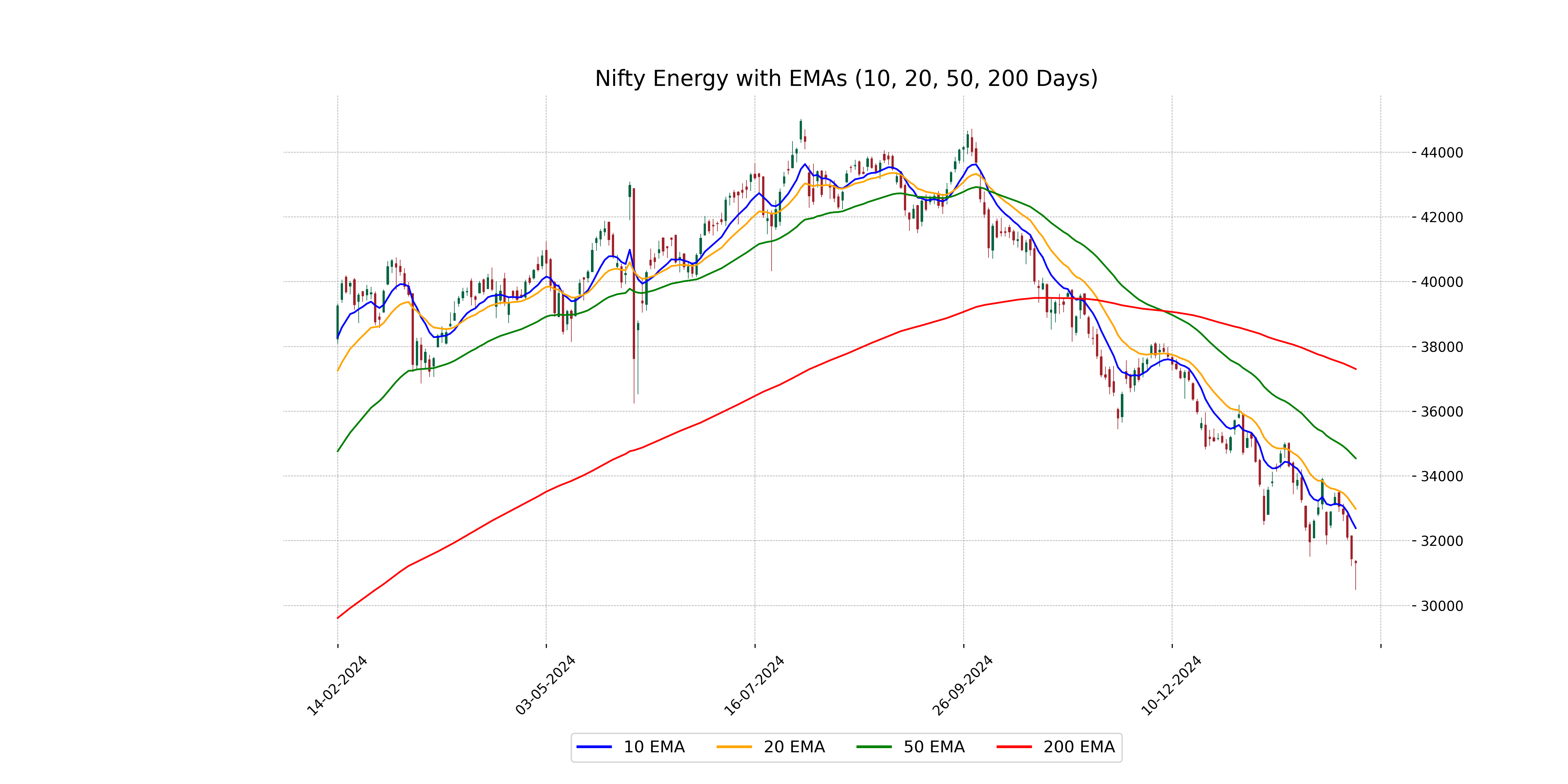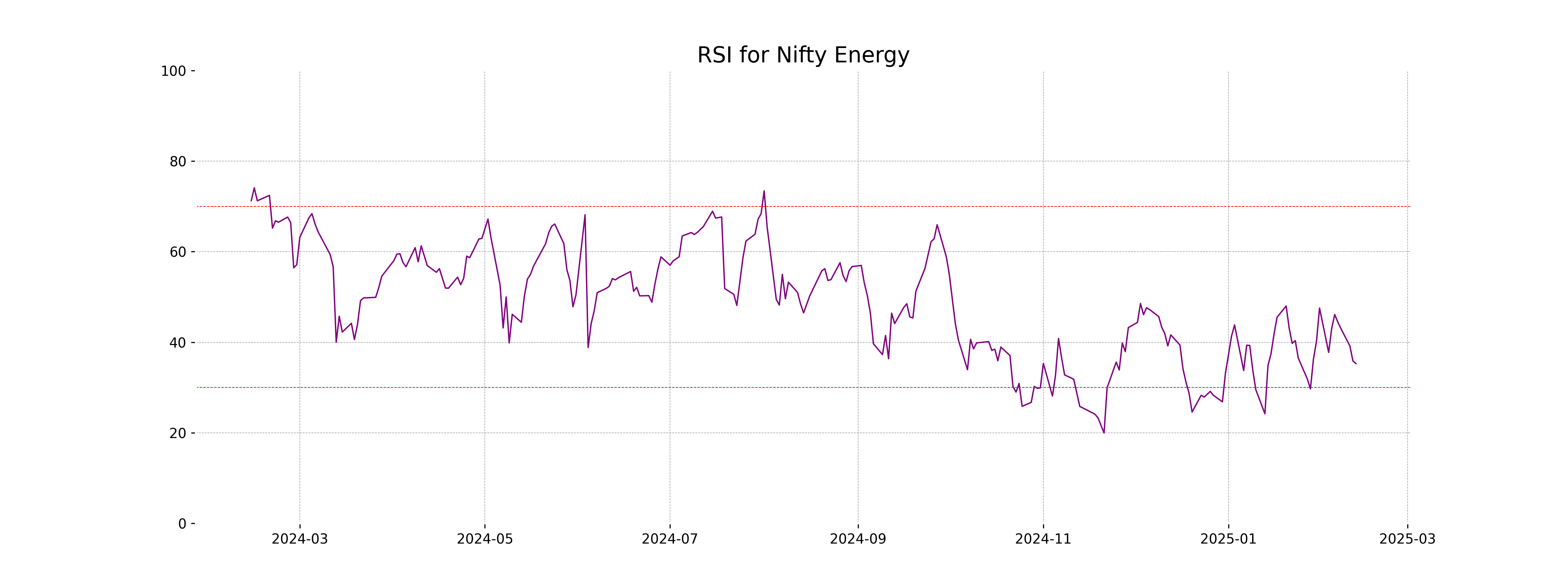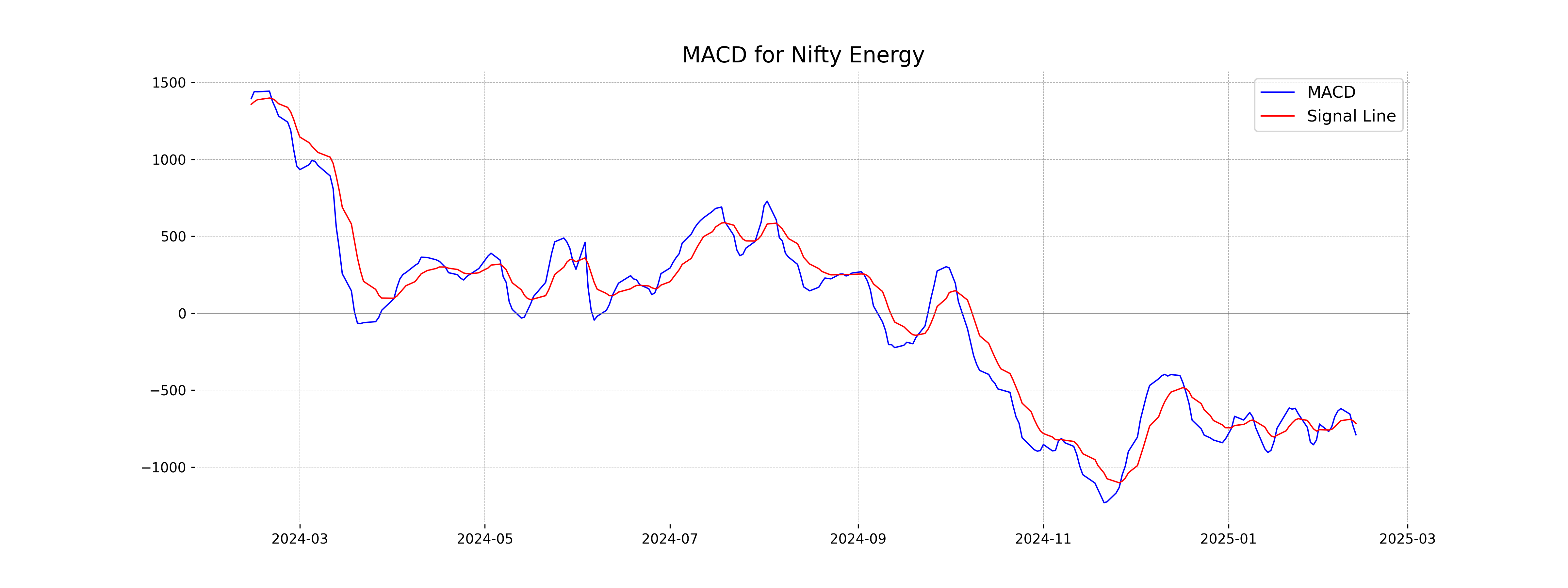 **MACD Analysis for Nifty Energy:** The MACD value is -789.61, which is below the MACD Signal value of -716.32. This indicates a bearish trend as the indicator suggests that downward momentum is increasing. With the Relative Strength Index (RSI) at 35.28, the index is also approaching oversold territory.