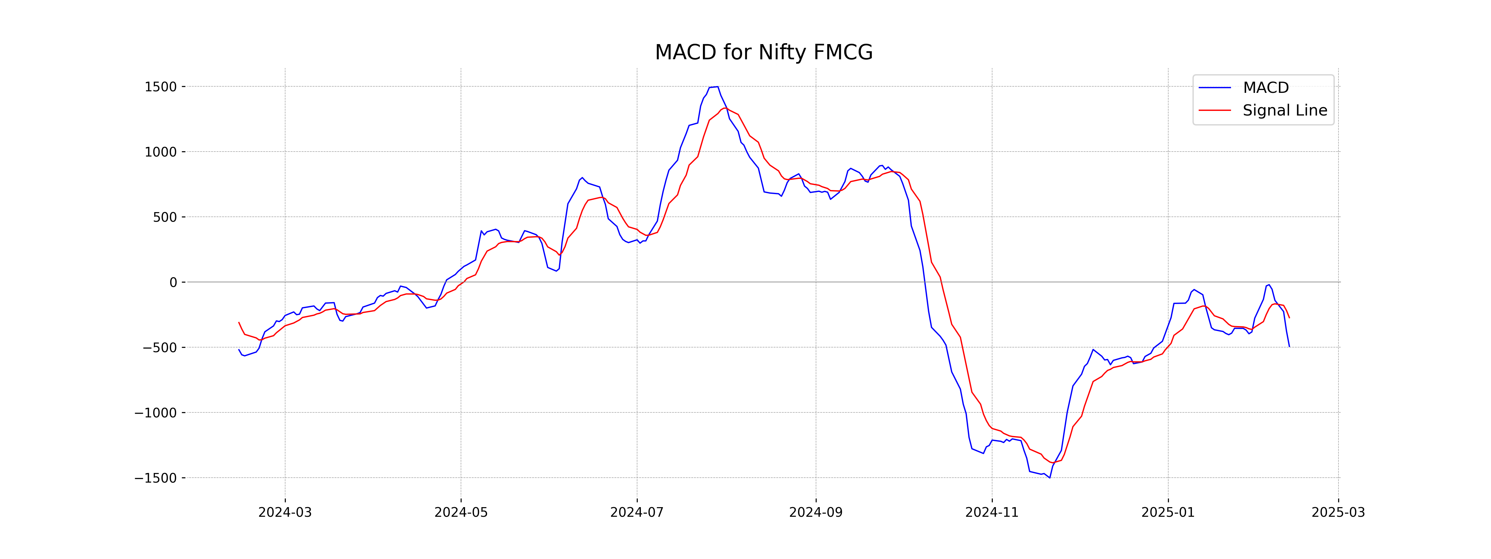 The MACD for Nifty FMCG is -492.77, while the MACD Signal is -273.21. This indicates a bearish trend as the MACD line is below the MACD Signal line, suggesting potential downward momentum in the stock price.