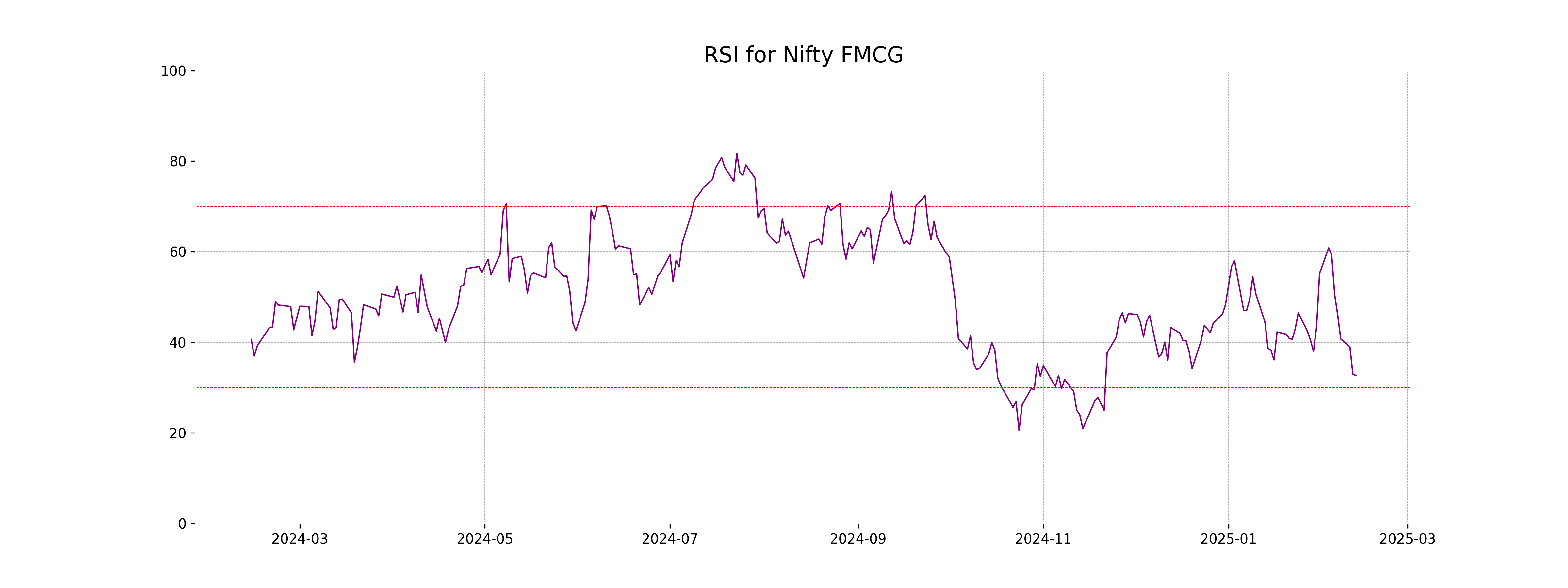 The RSI value for Nifty FMCG is 32.65, indicating it is approaching oversold levels. Typically, an RSI below 30 is considered oversold, suggesting potential for a price reversal or a buying opportunity if the trend changes.