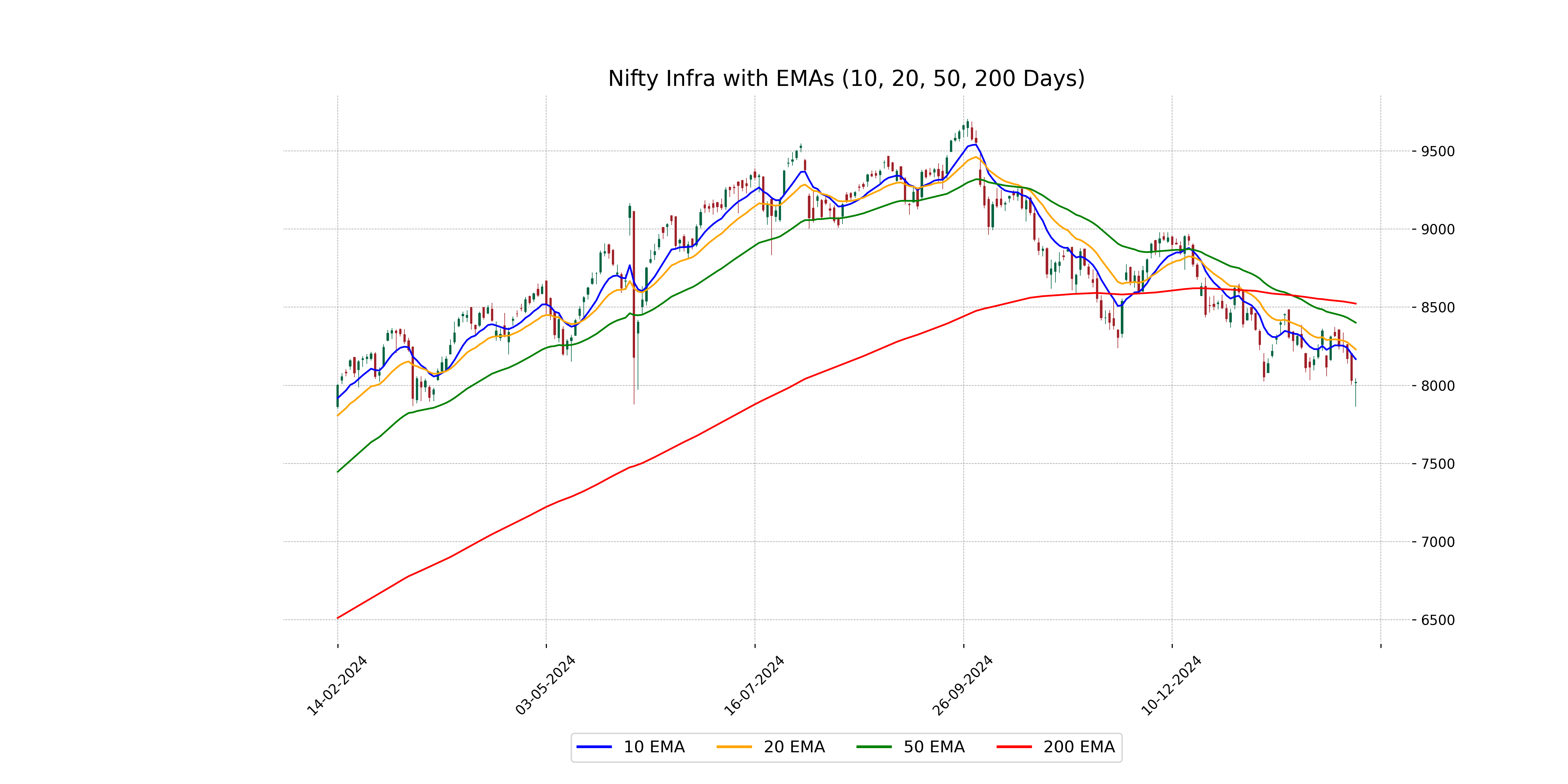 Nifty Infra opened at 8016.30 and closed slightly lower at 8019.65, indicating a marginal decline of 0.13% from the previous close. The index faced a downward momentum, with both its 50-day and 200-day EMAs above the current price, suggesting potential bearish trends. Additionally, a RSI below 40 and a negative MACD further reflect the prevailing negative sentiment.