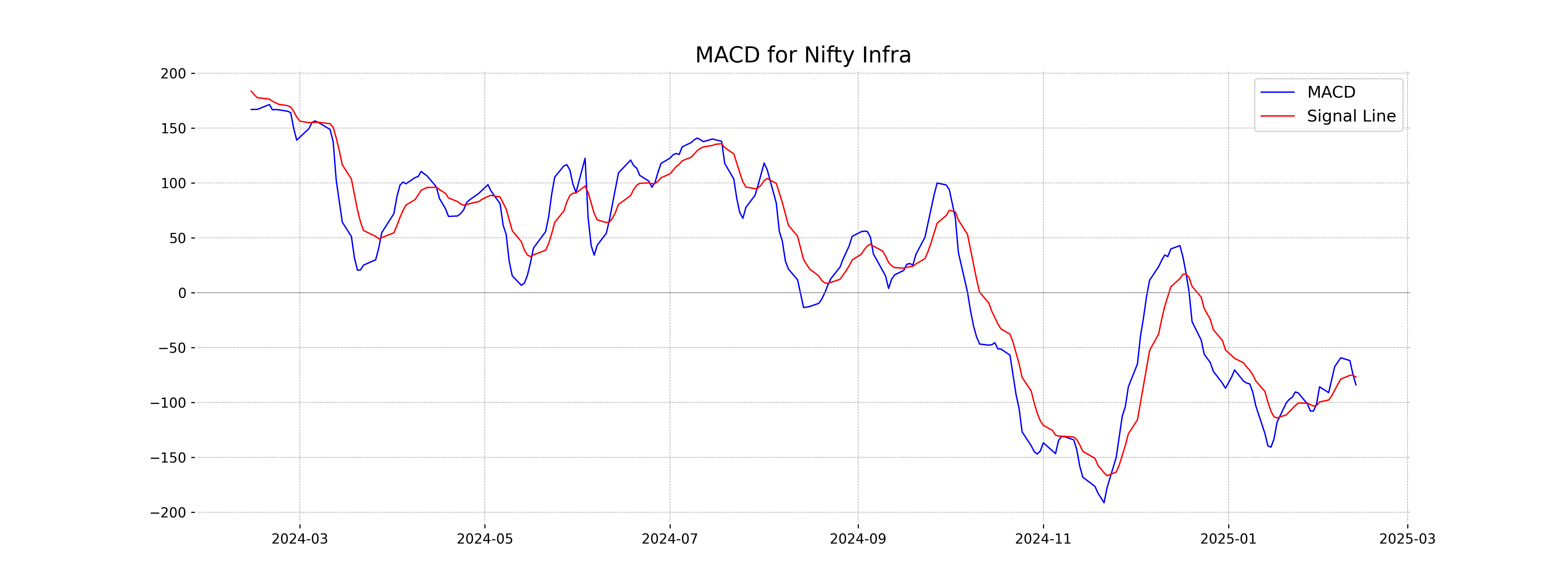 The MACD for Nifty Infra is at -84.16, which is below the MACD Signal of -77.03. This indicates a bearish momentum, as the MACD line is below the Signal line, suggesting potential continued downward pressure.