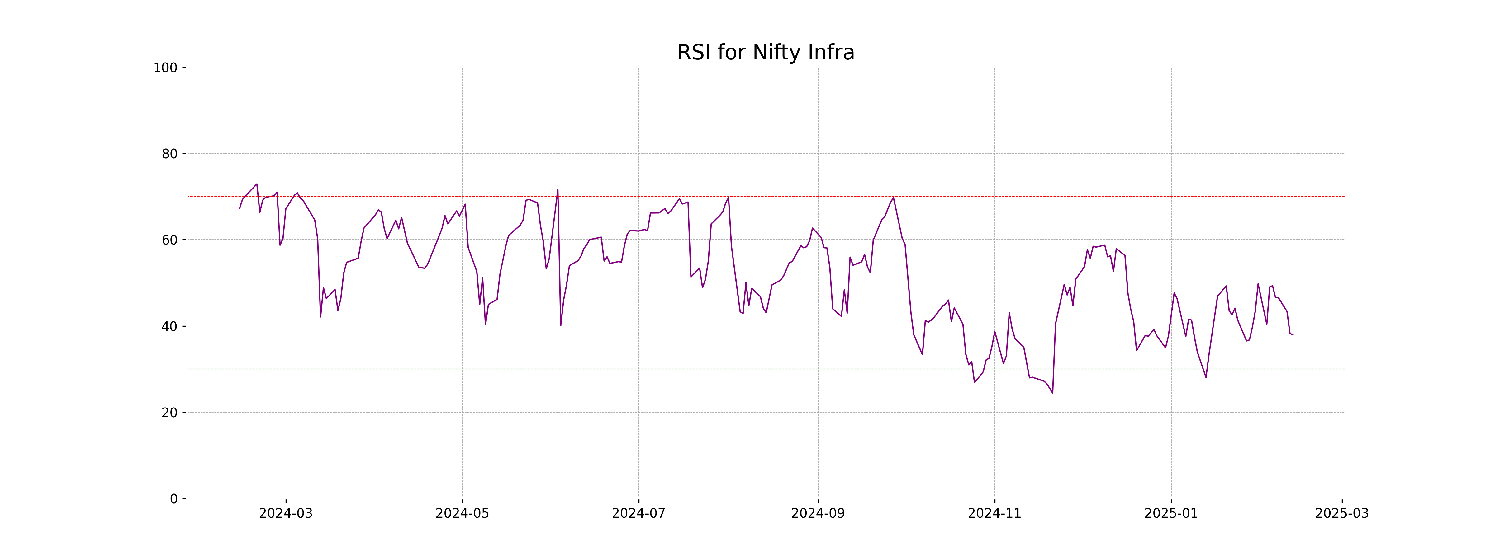 The RSI (Relative Strength Index) for Nifty Infra is 37.92, indicating that it is approaching the oversold territory. Values below 30 typically suggest that a security might be oversold, so investors may consider this level as a potential area for a price reversal or consolidation.
