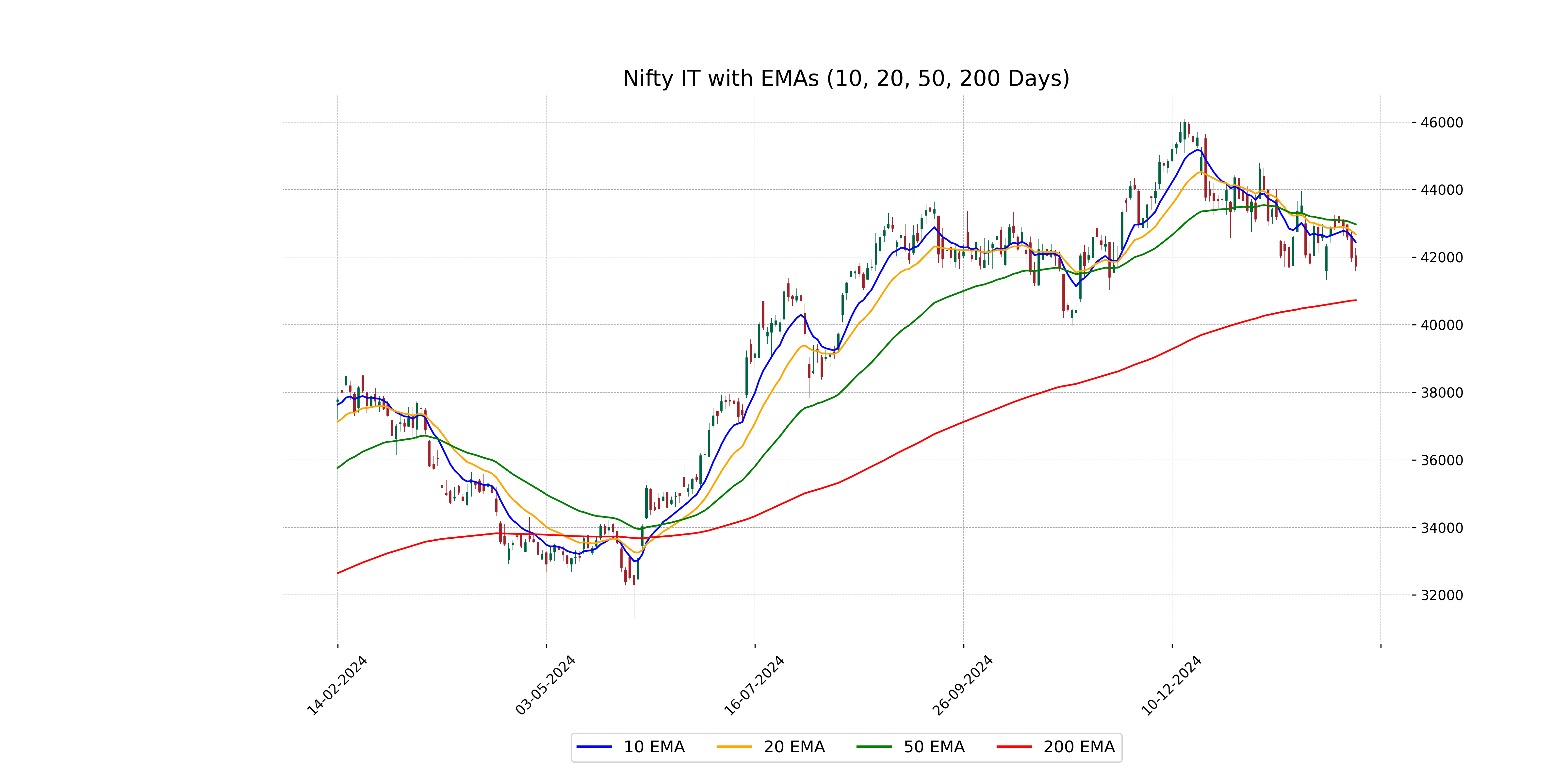 The closing price of Nifty IT at 41733.0 is below its 50-day EMA of 42972.31, indicating a bearish trend as it is also below the 10-day EMA of 42445.79 and the 20-day EMA of 42677.44. This suggests a negative momentum in the short to medium term.