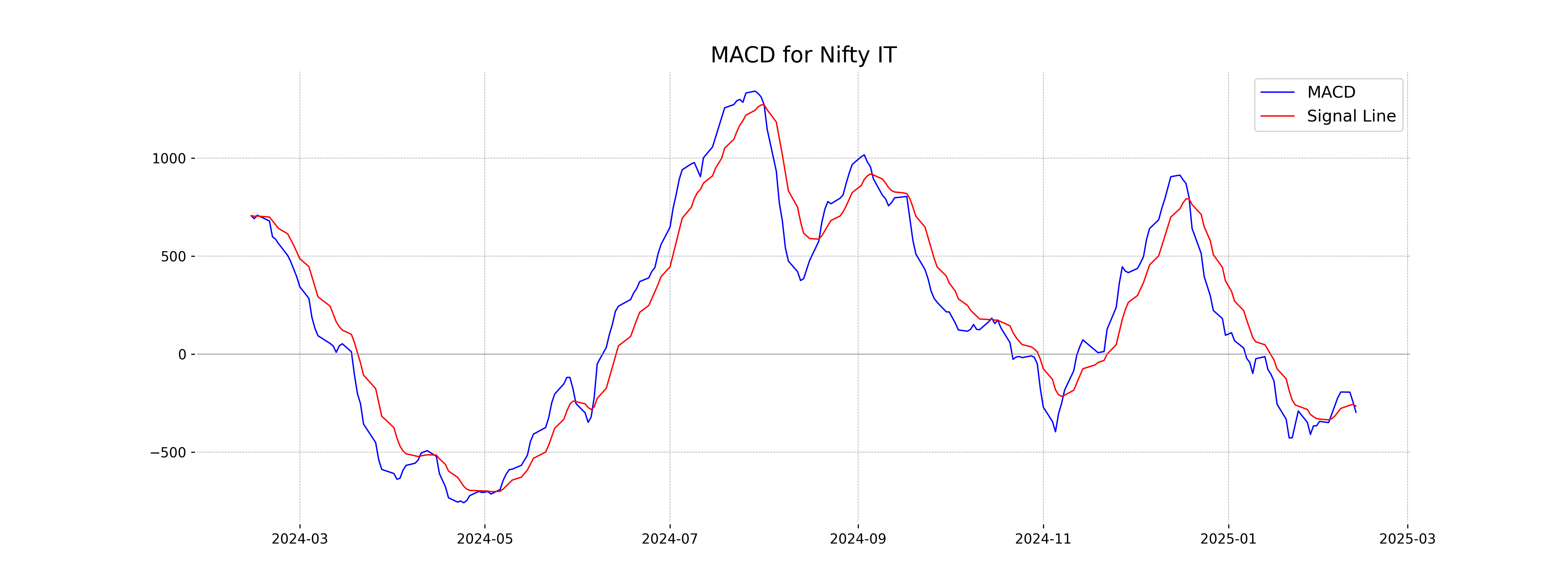 Based on the given data for Nifty IT, the MACD is -296.53 and the MACD Signal is -264.94, indicating a bearish trend as the MACD is below the Signal line. This suggests potential downward momentum in the current market conditions.