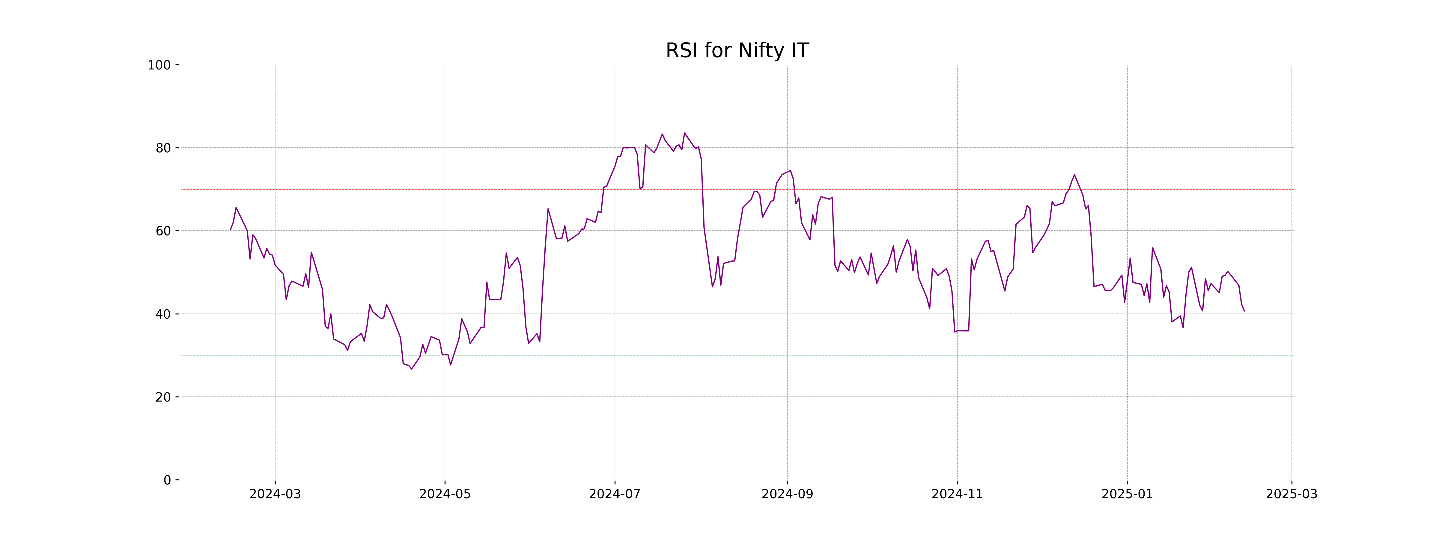 The RSI for Nifty IT is at 40.66, suggesting that the index is approaching oversold territory as RSI values below 30 typically indicate that condition. This could imply potential buying opportunities if the index continues to decline. However, investors should consider other technical indicators before making decisions.