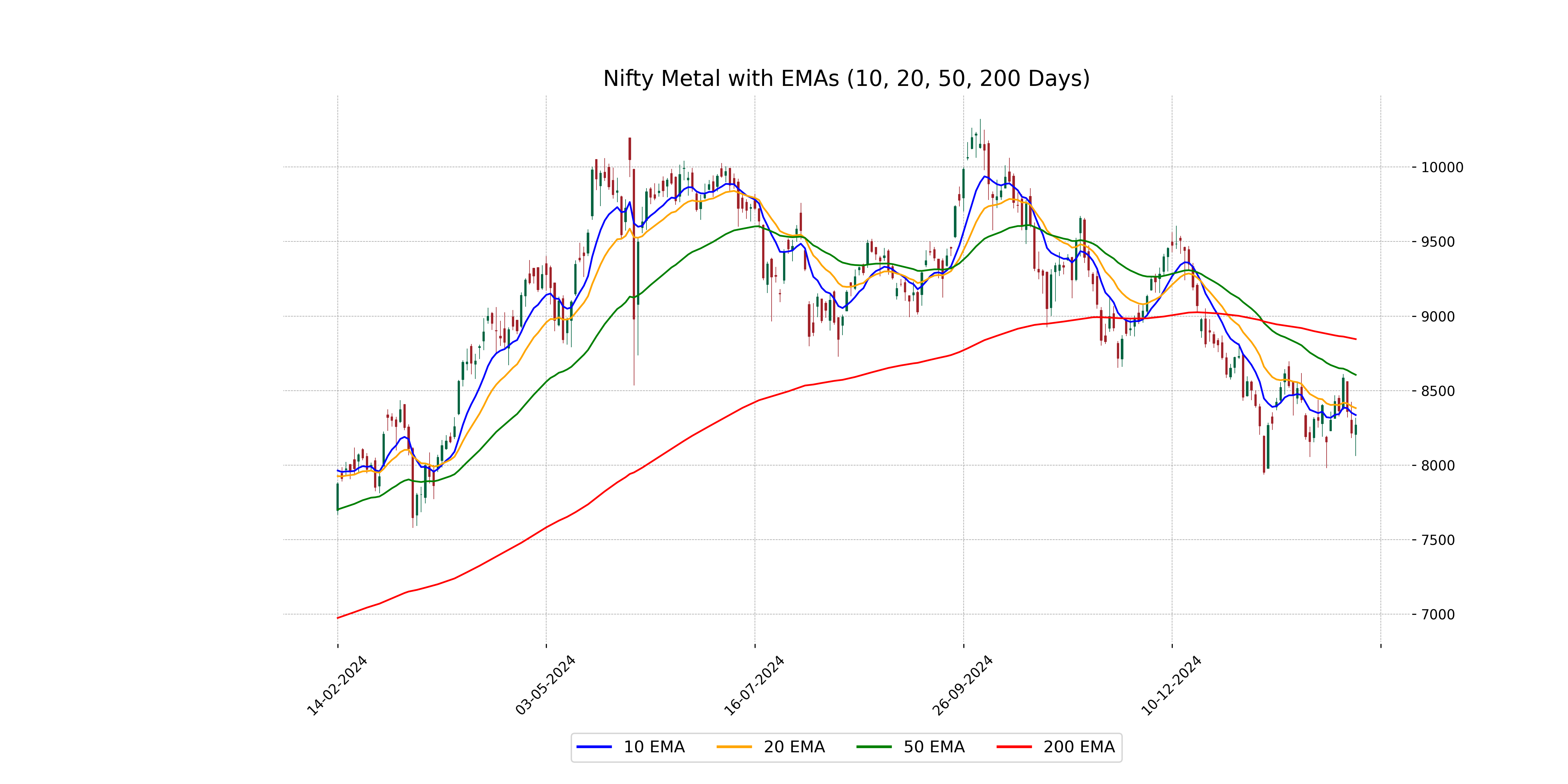 The Nifty Metal index closed at 8268.40, positioned below its 50-day EMA of 8605.85 and 200-day EMA of 8845.37, indicating a bearish trend. Additionally, it is also below its 10-day EMA of 8336.07 and 20-day EMA of 8382.53, suggesting recent weakness.
