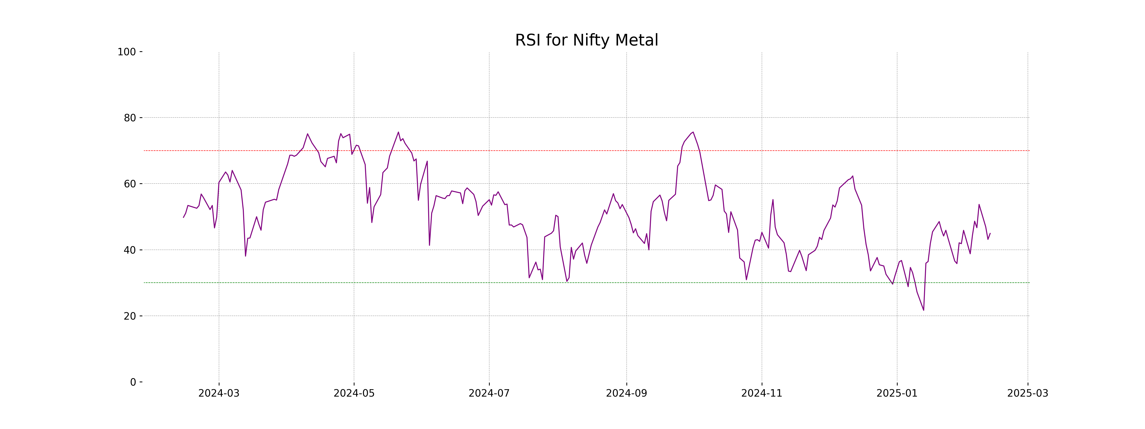 The RSI value for Nifty Metal is 44.92, which indicates that the stock is in a neutral position, neither overbought nor oversold. It suggests a lack of strong momentum in either direction, and investors might look for other indicators or wait for more movement.