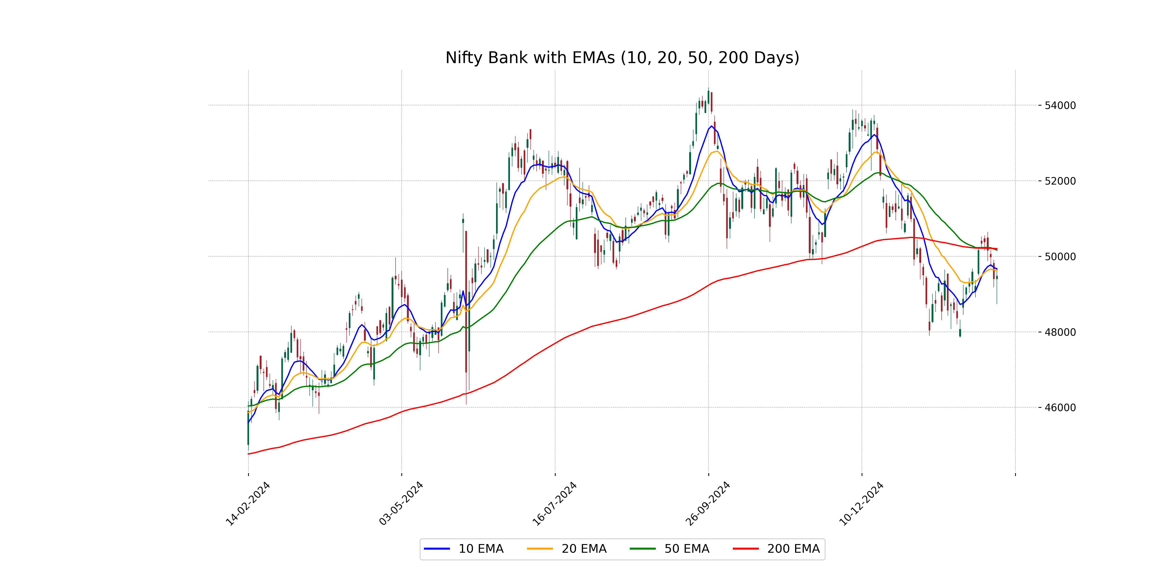 The Nifty Bank index closed at 49,479.45, which is below its 50-day EMA of 50,163.95 and 200-day EMA of 50,200.46, indicating a potential bearish trend. However, it remains slightly above the 10-day and 20-day EMAs of 49,664.18 and 49,621.41, respectively, suggesting some short-term strength.