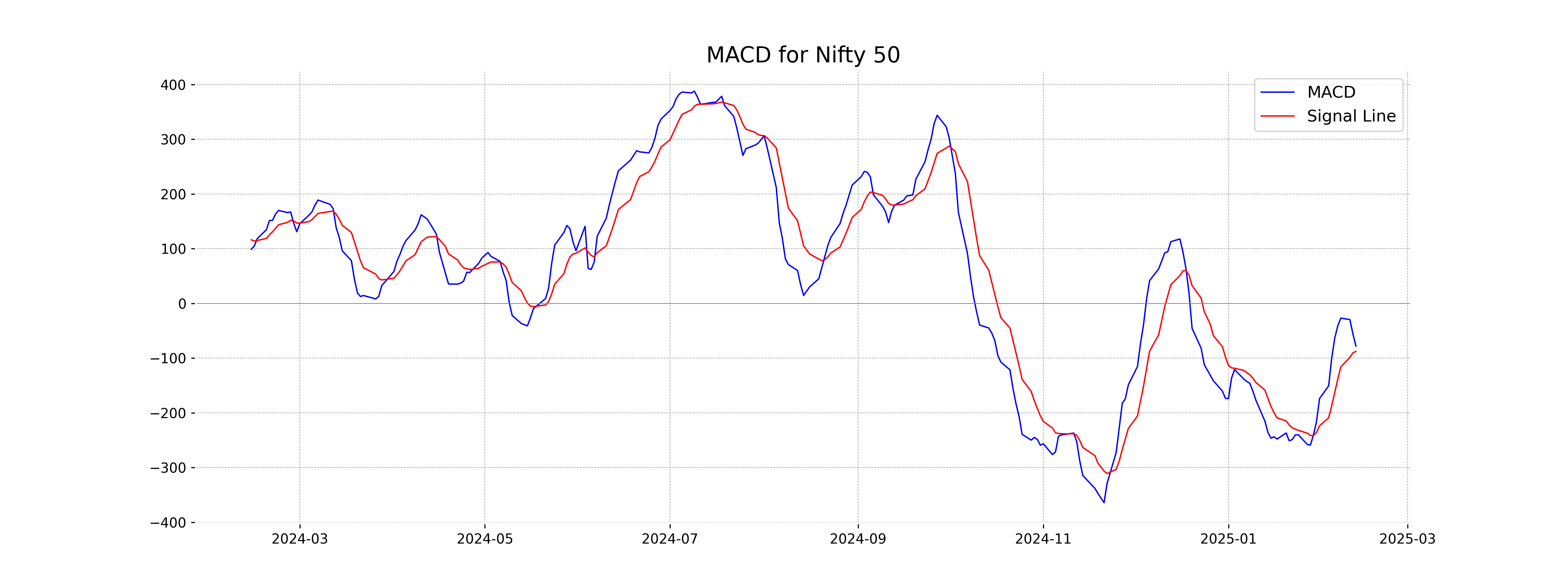 The MACD value for Nifty 50 is -78.08 with a signal of -87.78, indicating a bearish trend as the MACD line is above the signal line. This suggests downward momentum in the market, and the RSI at 40.91 further confirms weak relative strength.