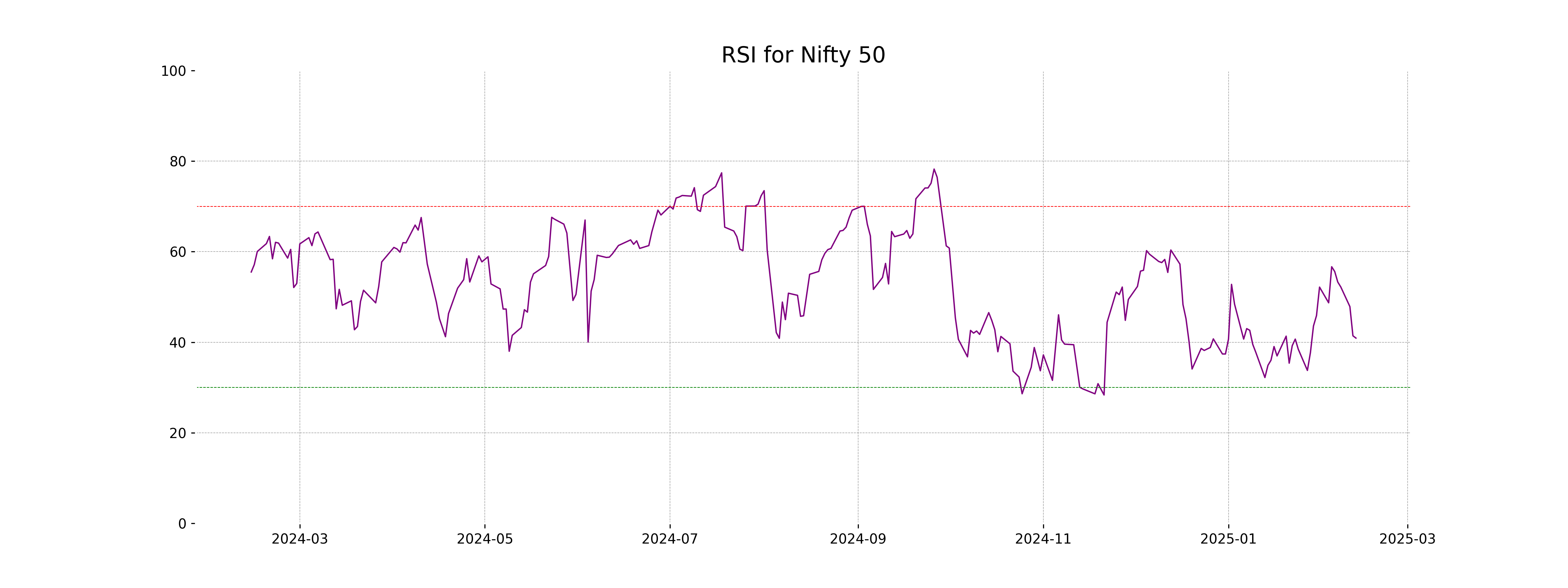 The Relative Strength Index (RSI) for Nifty 50 is currently at 40.91, which suggests that the index is approaching the oversold territory, typically below 30. This indicates potential underperformance relative to its recent price movements, and traders might watch for a reversal signal if the RSI continues to decline.