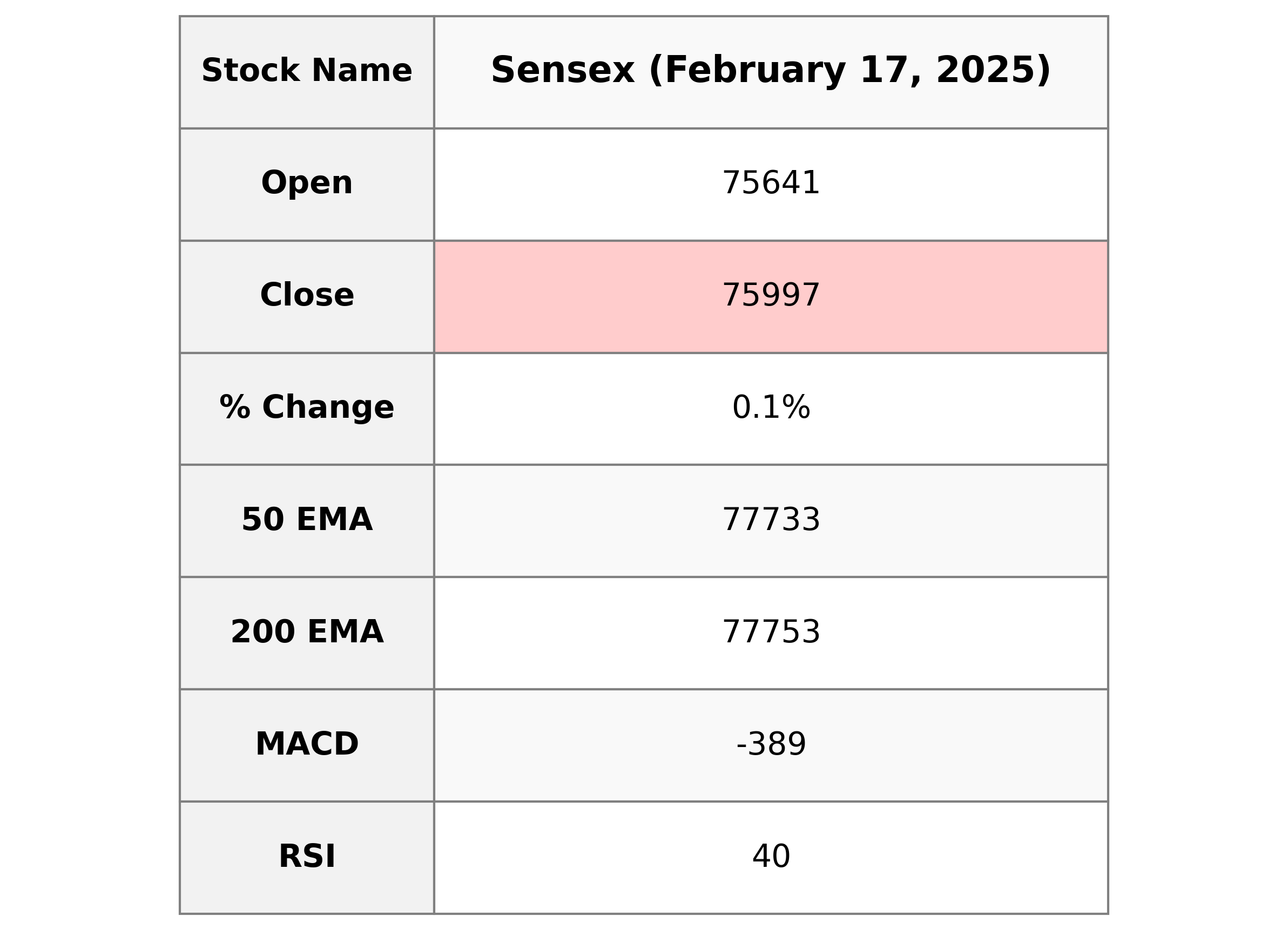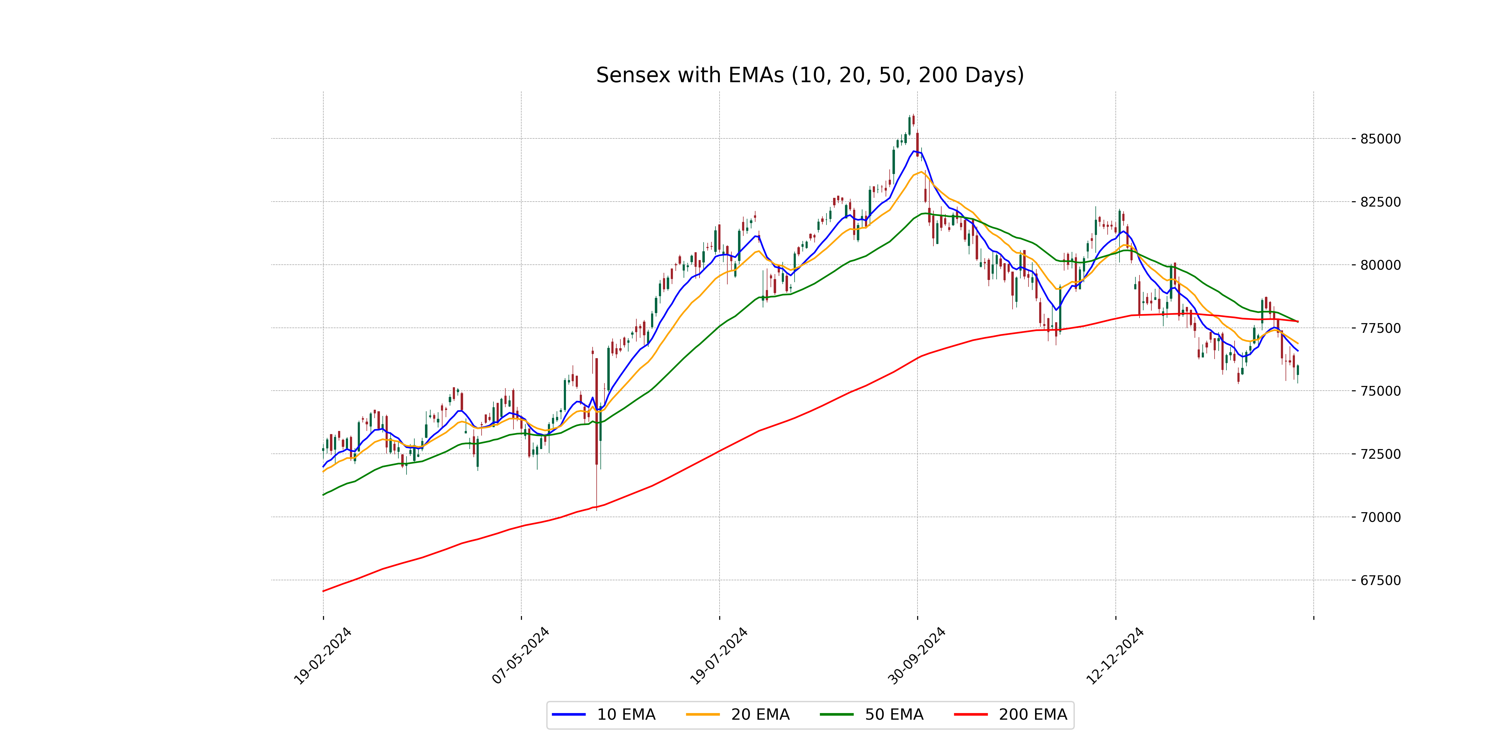 The Sensex closed at 75,996.86, which is below its 50 EMA (77,732.96) and 200 EMA (77,753.09), indicating potential bearish momentum. It is, however, above the 10 EMA (76,588.99) and 20 EMA (76,881.21), suggesting short-term positive movement in an overall downtrend.