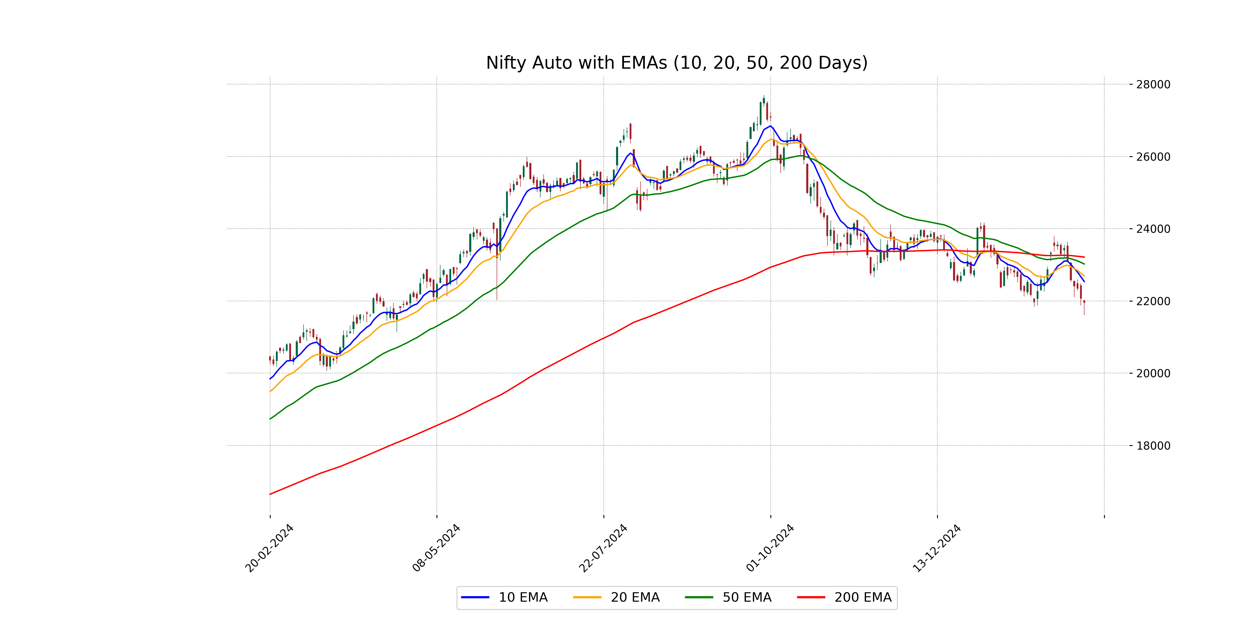 The closing price of Nifty Auto is 21,951.85, which is below the 50 EMA of 23,022.47 and the 200 EMA of 23,213.01, indicating a potential bearish trend in the short to long term. Additionally, it is below the 10 EMA of 22,535.35 and the 20 EMA of 22,691.75, suggesting a continuation of downward momentum in the recent days.