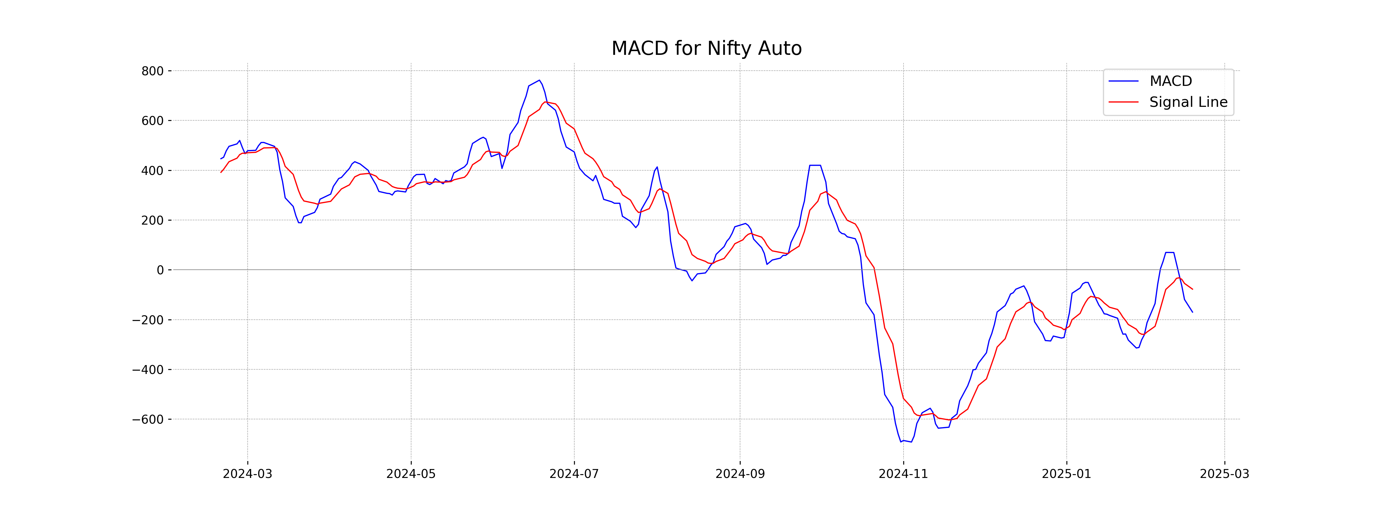 Based on the data, the MACD for Nifty Auto is -169.97, which is below its MACD Signal of -77.81. This indicates a bearish momentum. Additionally, the RSI being at 36.68 suggests that the index might be approaching oversold territory.