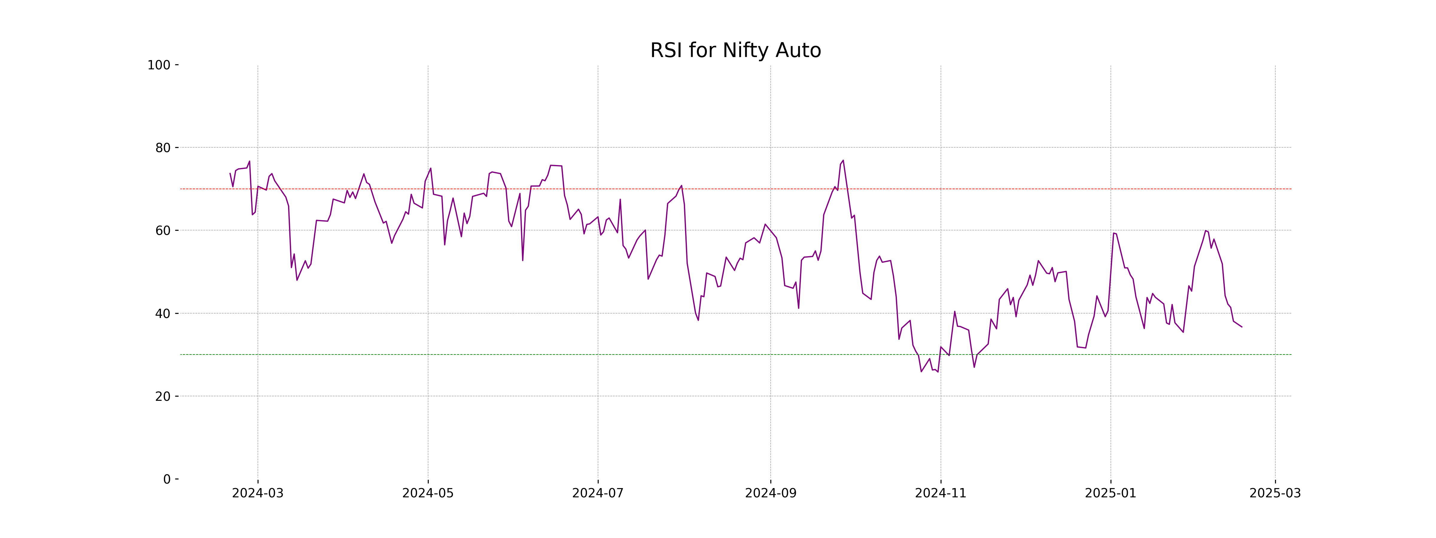 The RSI (Relative Strength Index) for Nifty Auto is 36.68, indicating that the index is currently in a bearish phase and nearing the oversold territory, which typically occurs below a level of 30. This may suggest potential for a reversal or consolidation if buying interest increases.