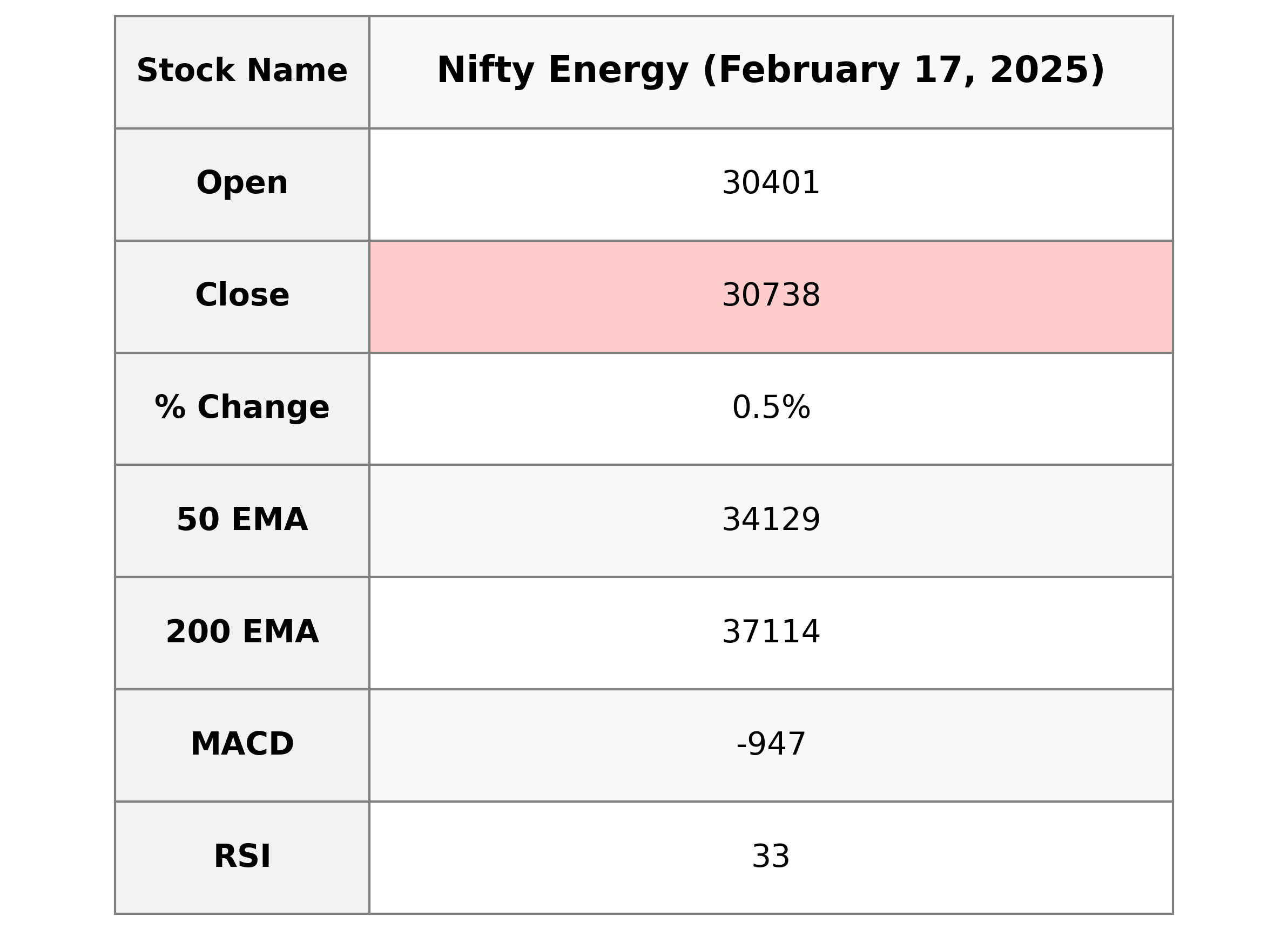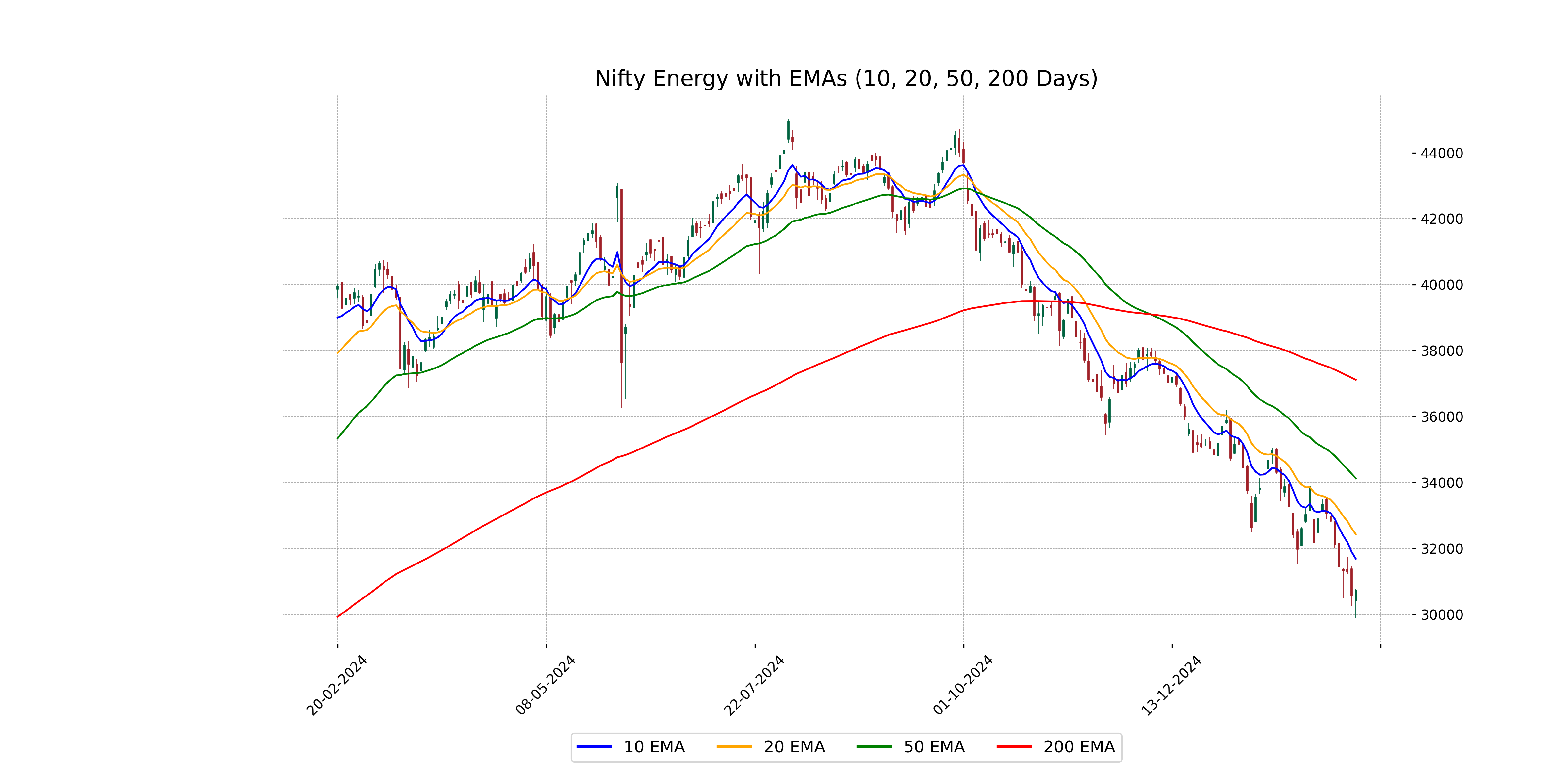 **Nifty Energy Performance:** The Nifty Energy index opened at 30,401.35 and closed higher at 30,737.55, marking a gain of approximately 0.54% with a points change of 165.25. Despite the positive movement in closing value, the technical indicators show a bearish sentiment, with the MACD significantly below the signal line and an RSI of 33.29, indicating possible overselling. The index remains below its 50, 100, and 200 EMA levels, suggesting a bearish trend in the broader market context.