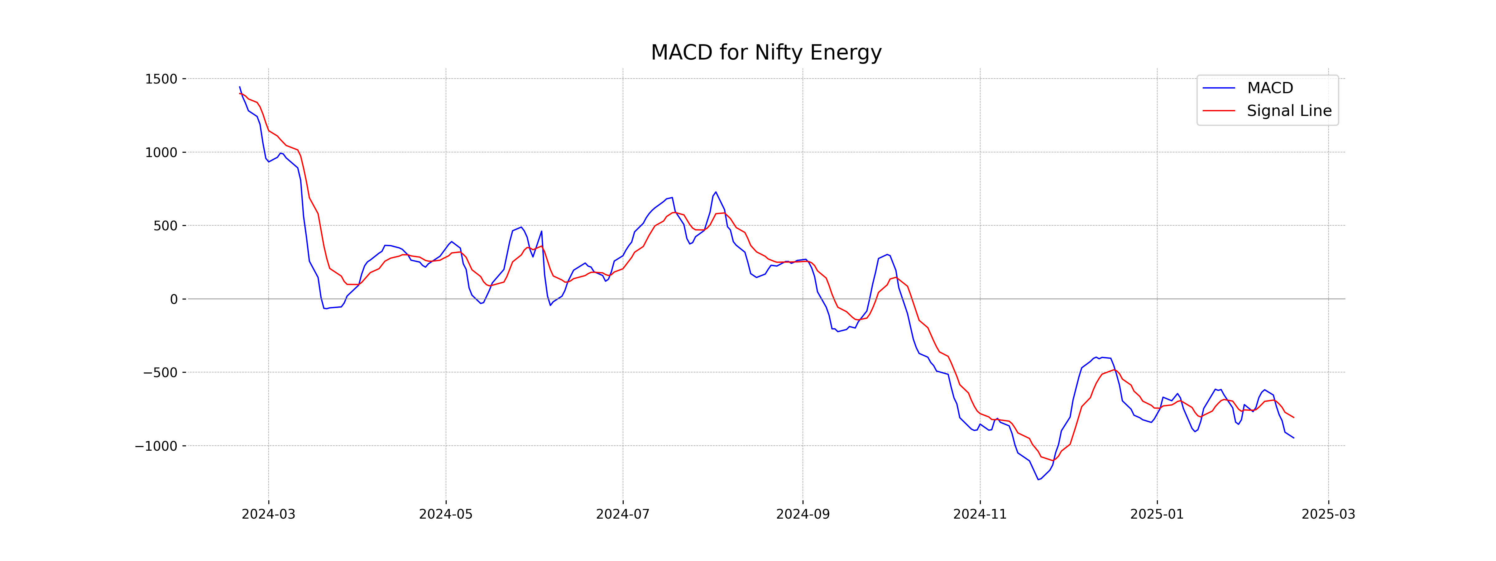 Based on the data, the MACD for Nifty Energy is negative at -947.04, indicating a potential bearish trend in the market. The MACD is below the signal line (-807.77), which may suggest that the index could continue to experience downward pressure.