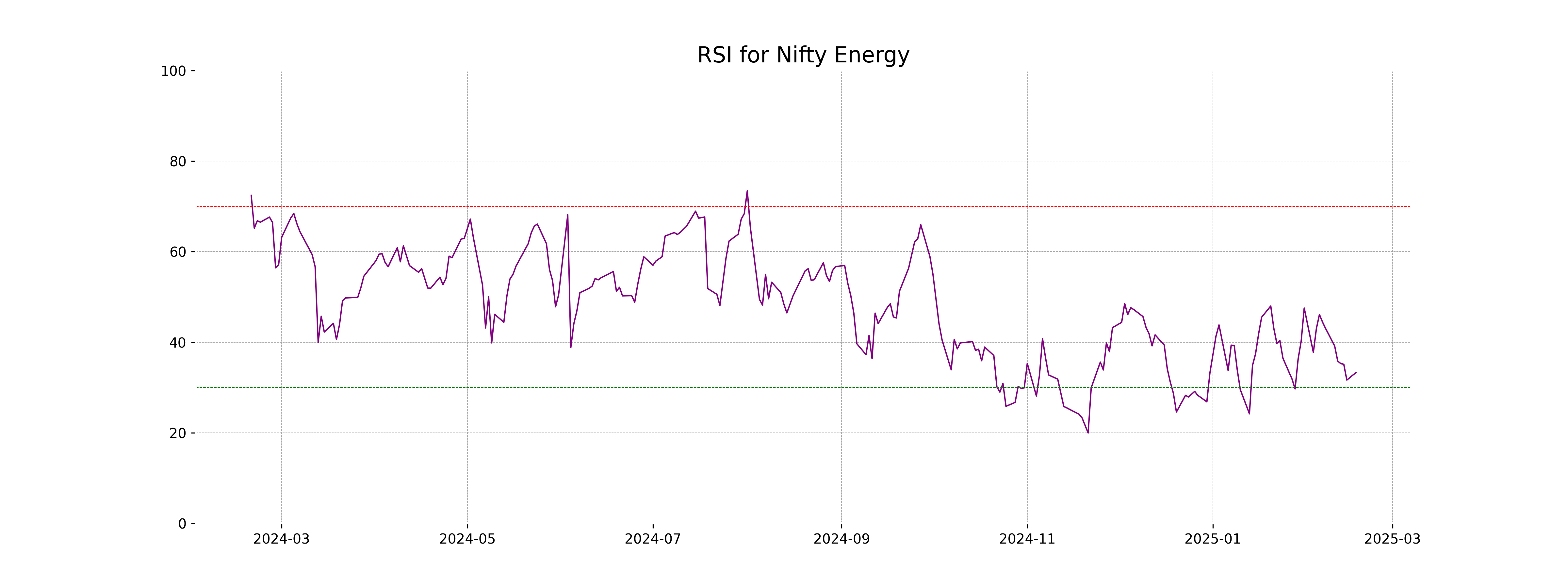 The current RSI for Nifty Energy is 33.29, indicating that the index is moving towards the oversold territory. This suggests a potential buying opportunity if the downtrend reverses, but investors should remain cautious as a low RSI can also signal continued bearish momentum.