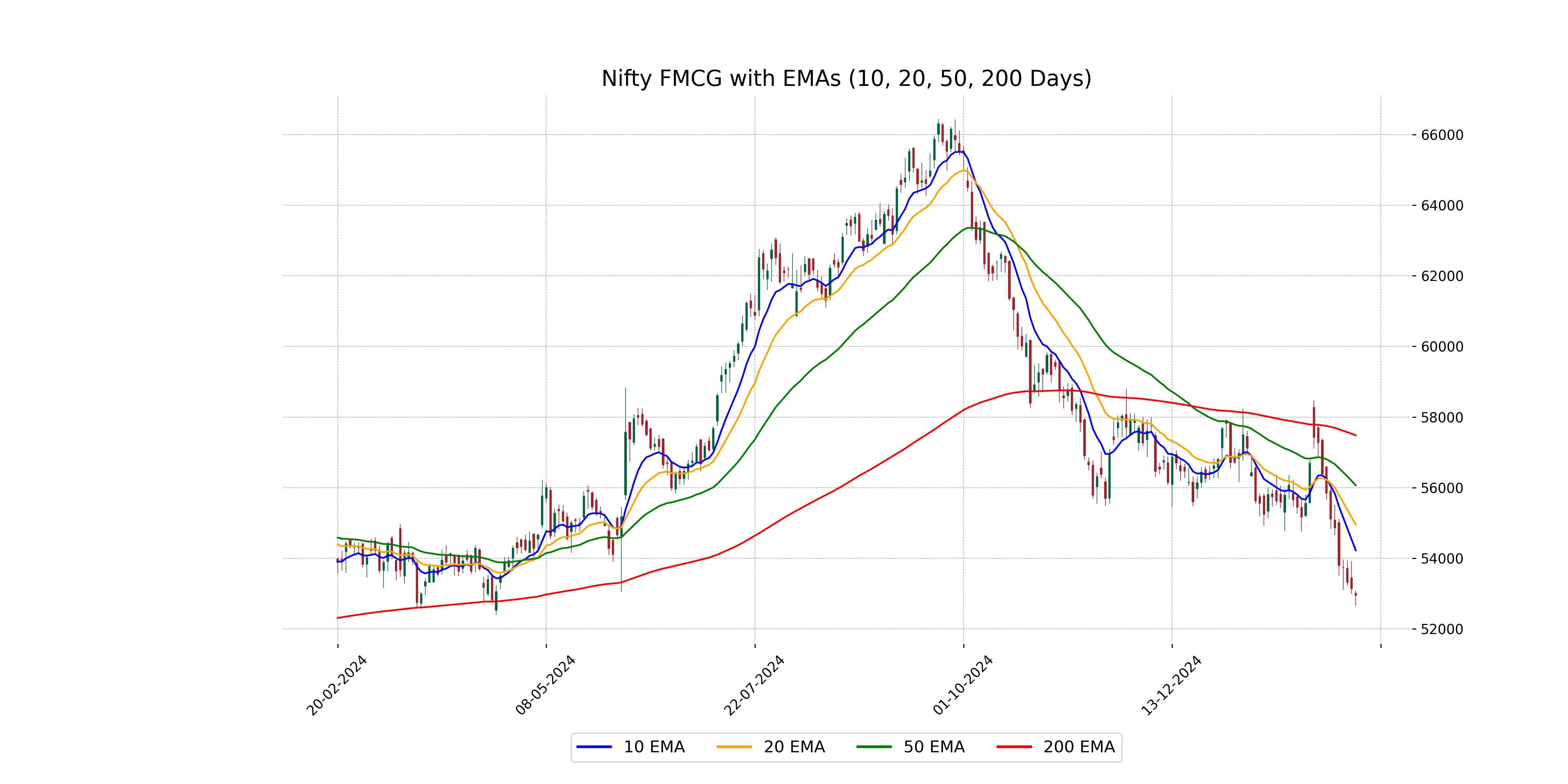 The Nifty FMCG index is currently trading below its 10-day EMA of 54225.77, 20-day EMA of 54953.96, 50-day EMA of 56067.53, and 200-day EMA of 57482.47, indicating a bearish trend in comparison to these key moving averages. The significant RSI value of 28.61 further suggests oversold conditions in the index.