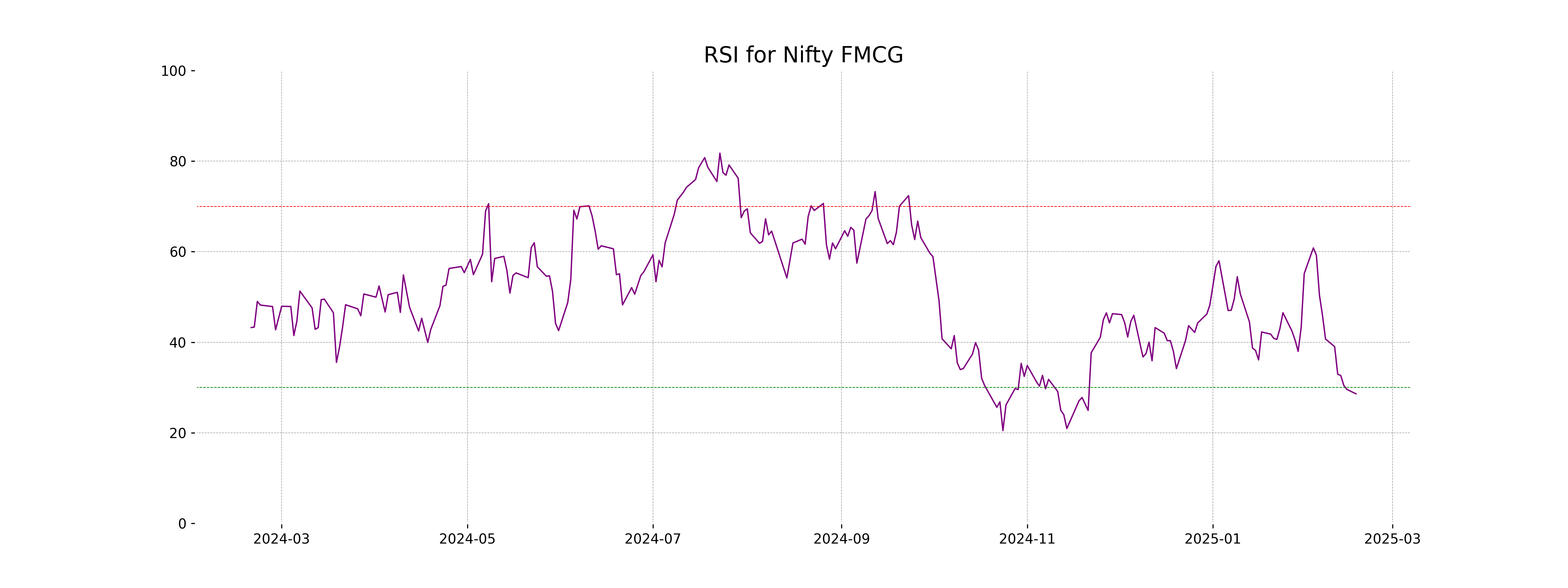 The relative strength index (RSI) for Nifty FMCG is 28.61, which indicates that the stock is currently in the oversold territory. This may suggest a potential buying opportunity as the RSI value is below 30, often seen as a threshold for oversold conditions.