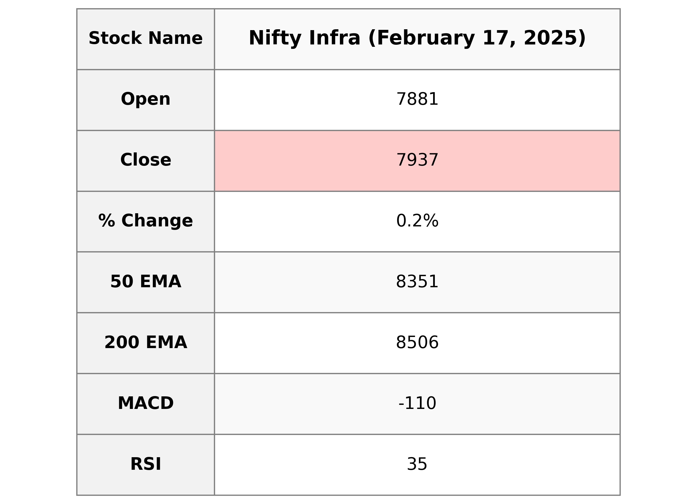 Nifty Infra opened at 7881.25 and closed at 7937.40, showing a slight increase of 0.18%. The RSI is at 35.42, indicating the index may be approaching an oversold region. The MACD is negative at -109.91, suggesting bearish momentum, while it trades below key EMAs, pointing towards a potential continuation of the downtrend.