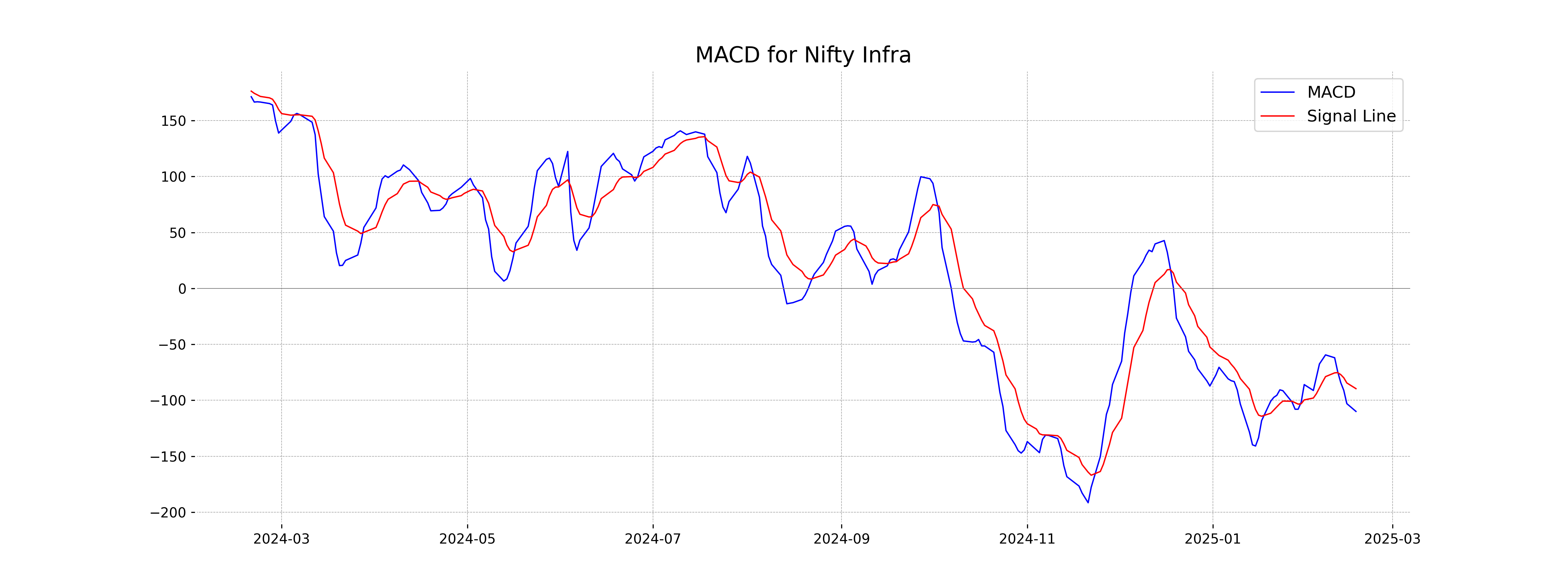 **MACD Analysis for Nifty Infra:** The MACD for Nifty Infra is negative at -109.91, which suggests a bearish sentiment as it is below the signal line at -89.56. This indicates a potential continuation of the downward trend.
