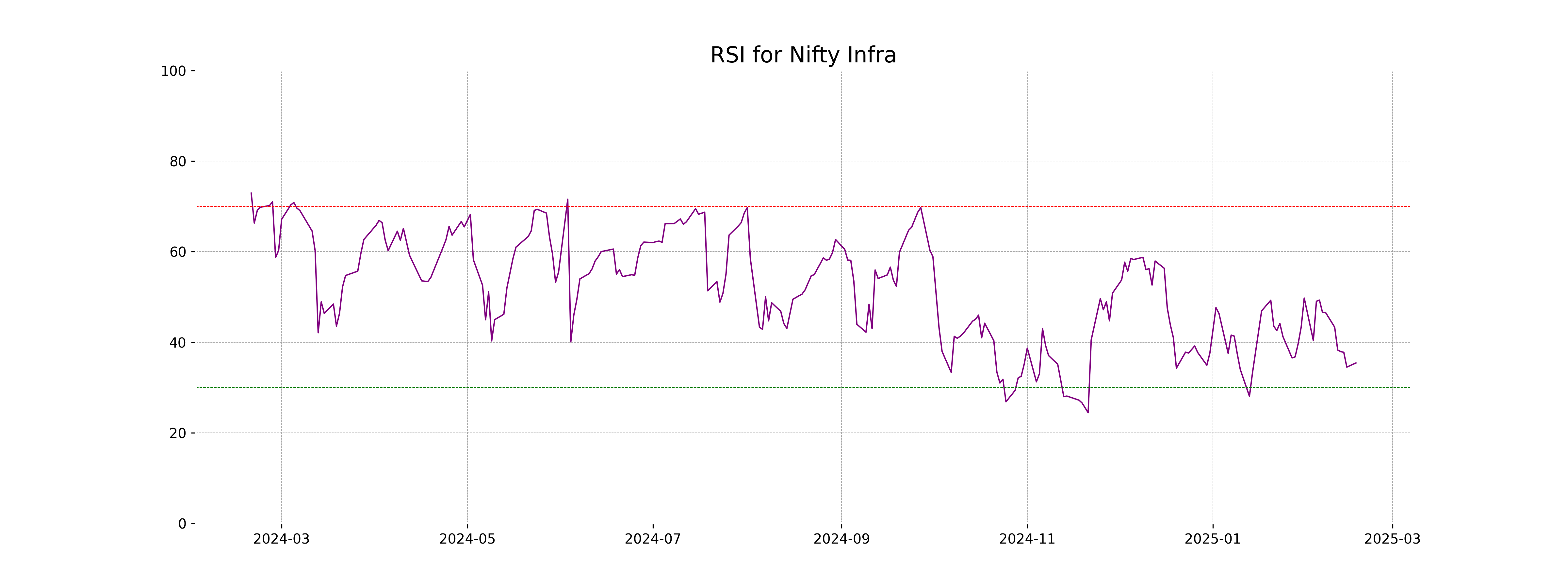 The RSI value for Nifty Infra is 35.42, which suggests that the index is close to being oversold. An RSI below 30 typically indicates an oversold condition, which might suggest a potential buying opportunity if other indicators align. However, since it's above 30, careful monitoring of other technical indicators is advisable.