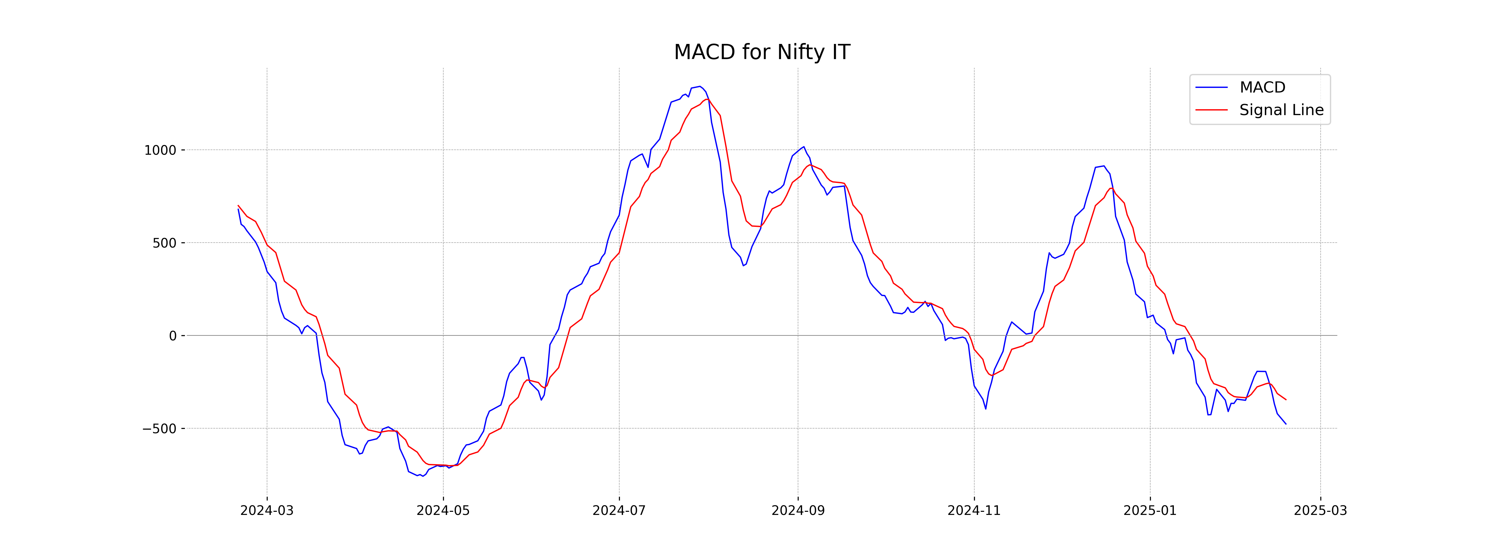 Nifty IT's MACD of -476.92 is below its signal line of -345.66, indicating a bearish momentum. This suggests potential continued downward price pressure, as reflected in the negative MACD value compared to the signal line.