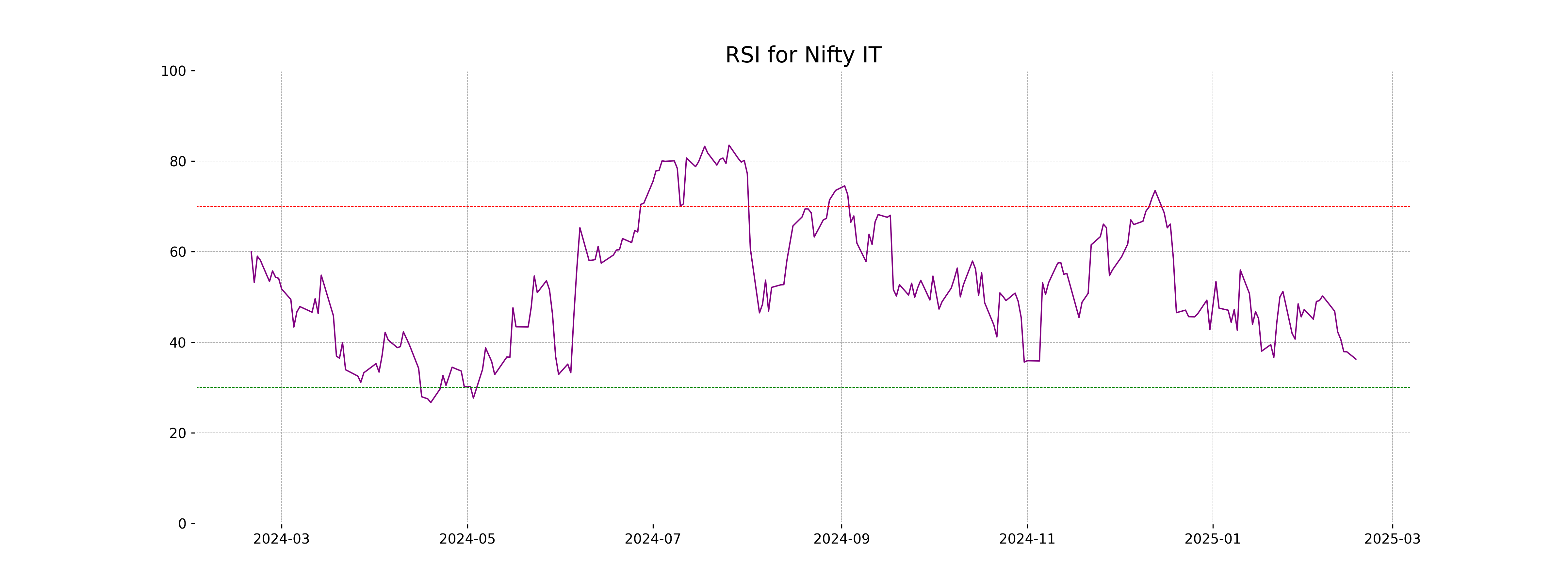 Based on the provided data, the Nifty IT index shows a Relative Strength Index (RSI) of 36.26. An RSI below 30 is typically considered oversold, while a value near 36 suggests it is nearing oversold territory, indicating potential for a reversal or continued weakness in the near term.