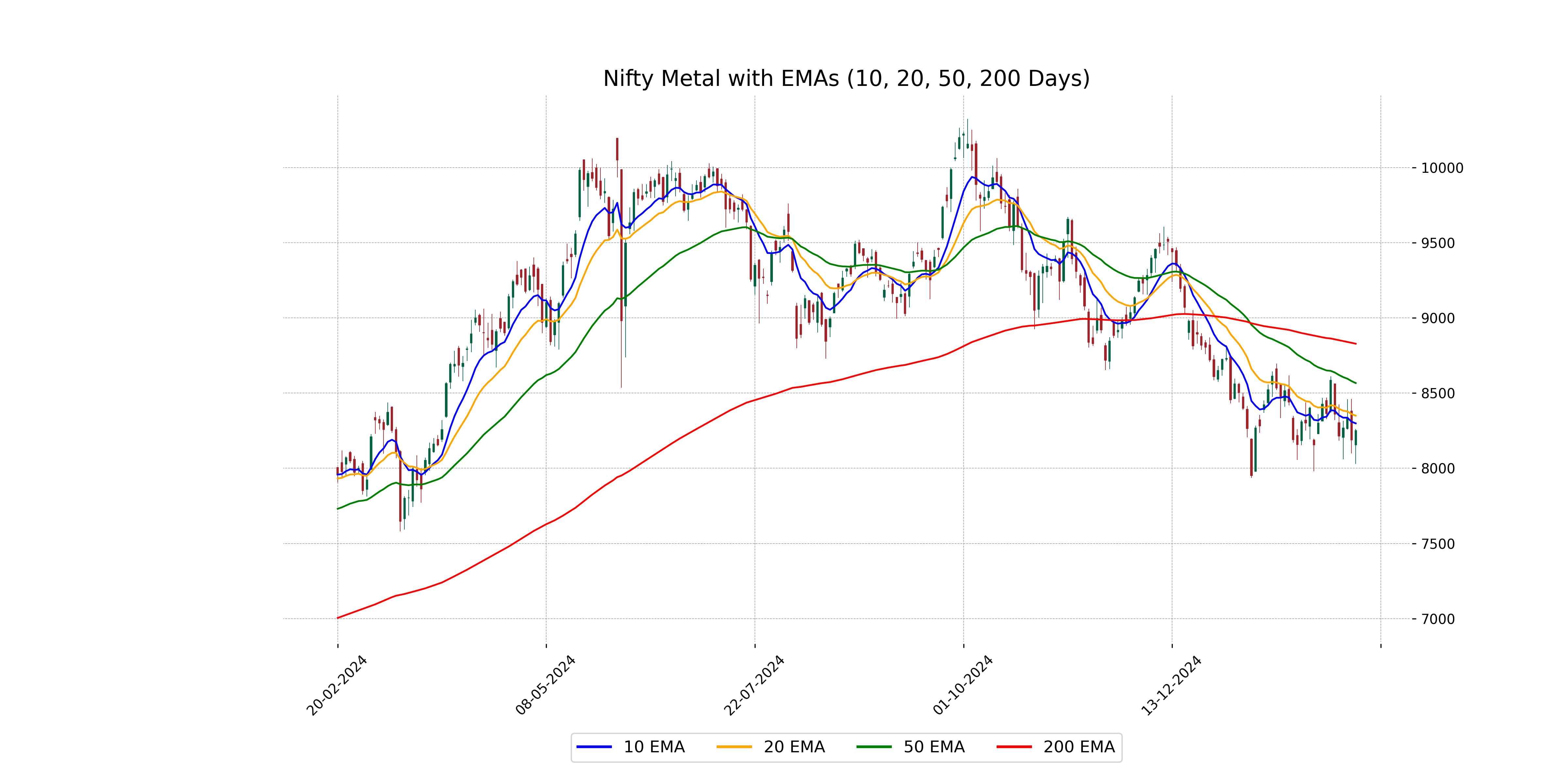 The closing price of Nifty Metal at 8250.20 is below its 10 EMA at 8298.39, 50 EMA at 8566.38, and 200 EMA at 8828.10. This indicates a bearish trend, as the current price is below these key moving averages, suggesting potential resistance at these levels.