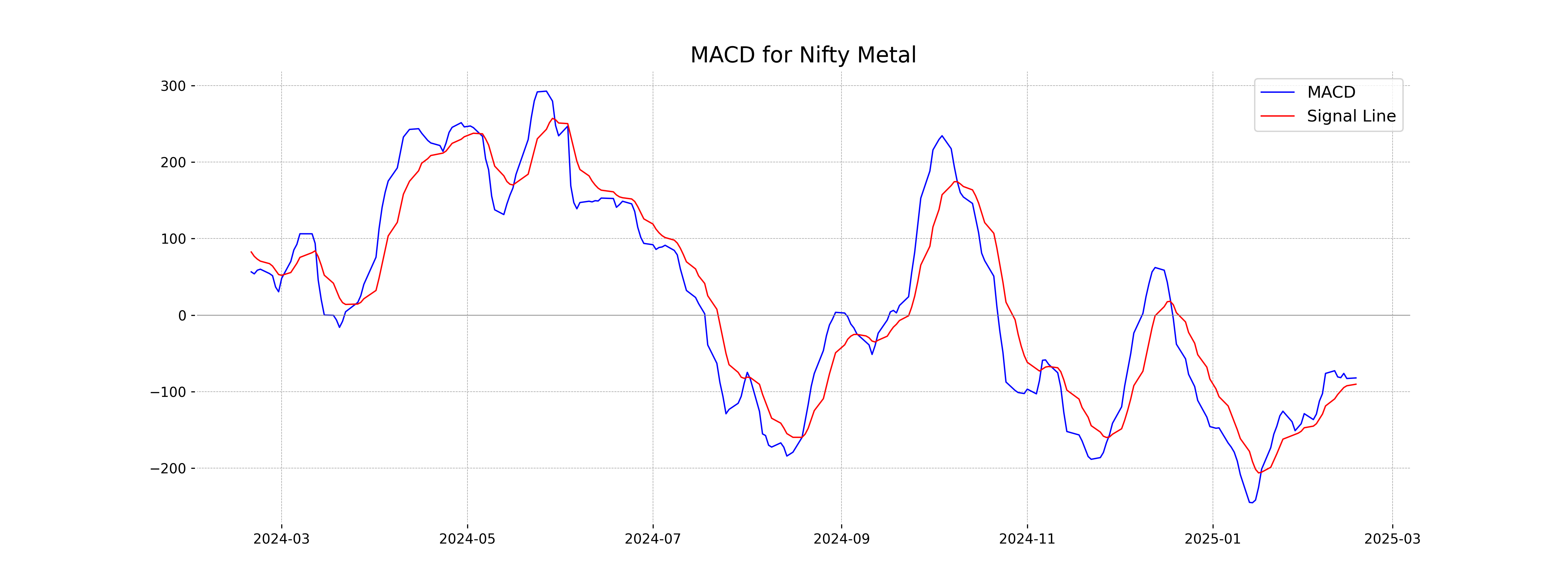 The MACD for Nifty Metal is at -82.127, with the MACD Signal at -90.321. This indicates a negative trend, as the MACD is below the signal line, suggesting bearish momentum.