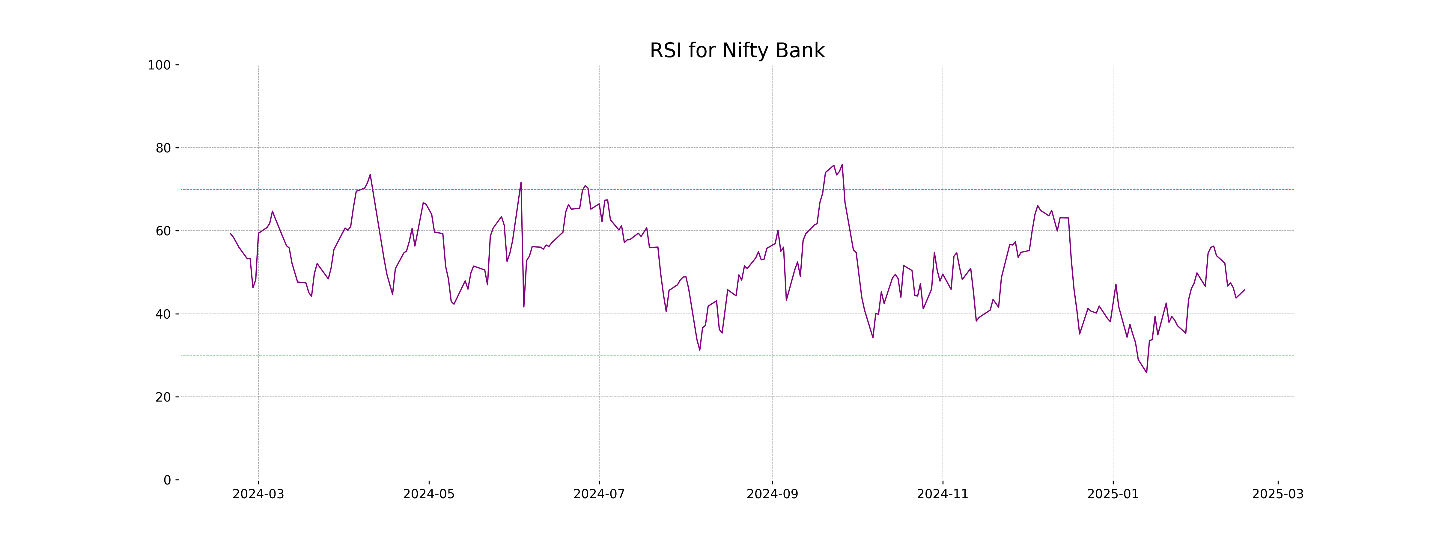 RSI for Nifty Bank is at 45.73, indicating a neutral market condition. If RSI moves towards 30, it would suggest an oversold condition, whereas a move towards 70 would indicate an overbought situation. Currently, RSI suggests no strong momentum in either direction.