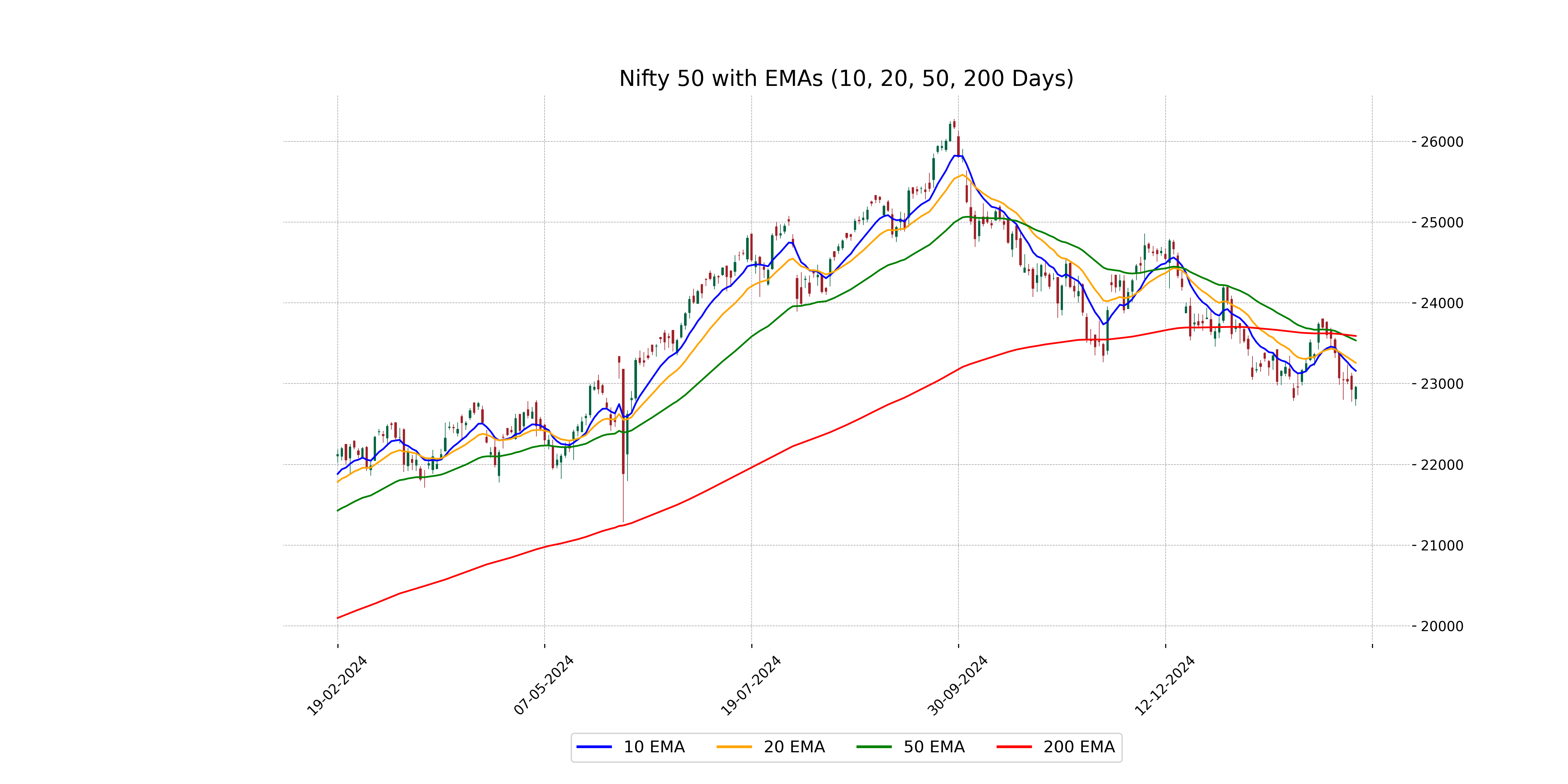 The Nifty 50's closing price of 22,959.5 is below its 50-day EMA of 23,535.76 and 200-day EMA of 23,590.99, suggesting a bearish trend. It is also below the 10-day and 20-day EMAs, indicating short-term downward momentum.