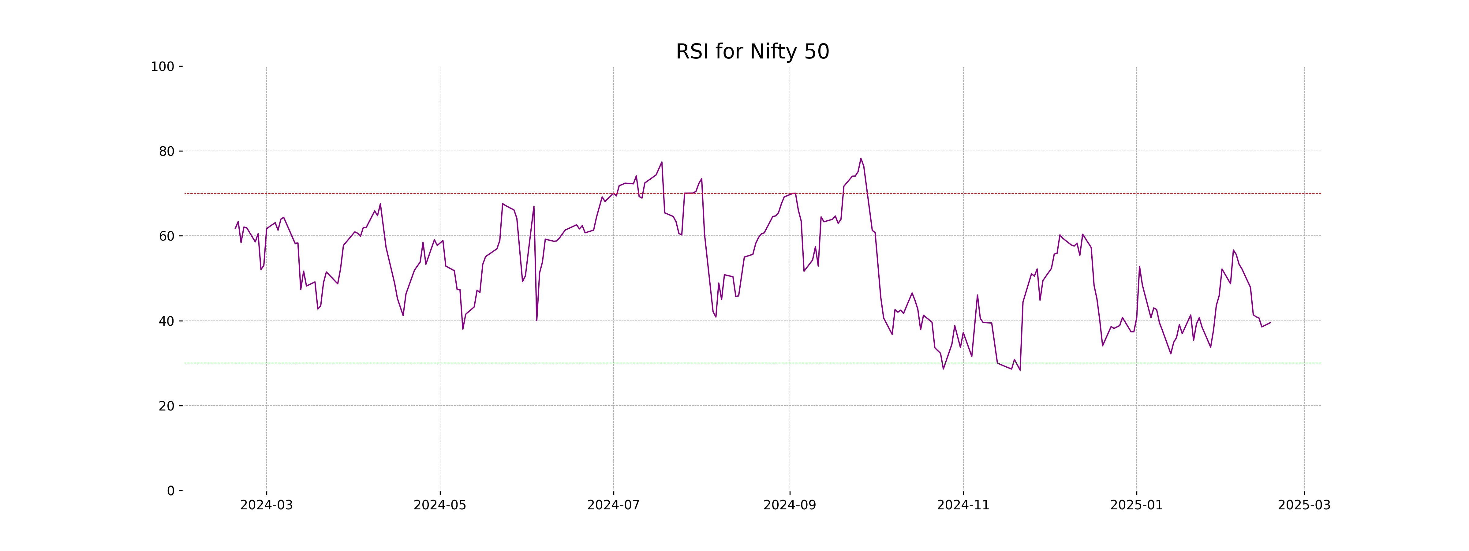 The Relative Strength Index (RSI) for Nifty 50 is 39.53, which suggests that the index is approaching the oversold territory. This indicates a potential for buying opportunities, as RSI values below 30 generally suggest an oversold condition.