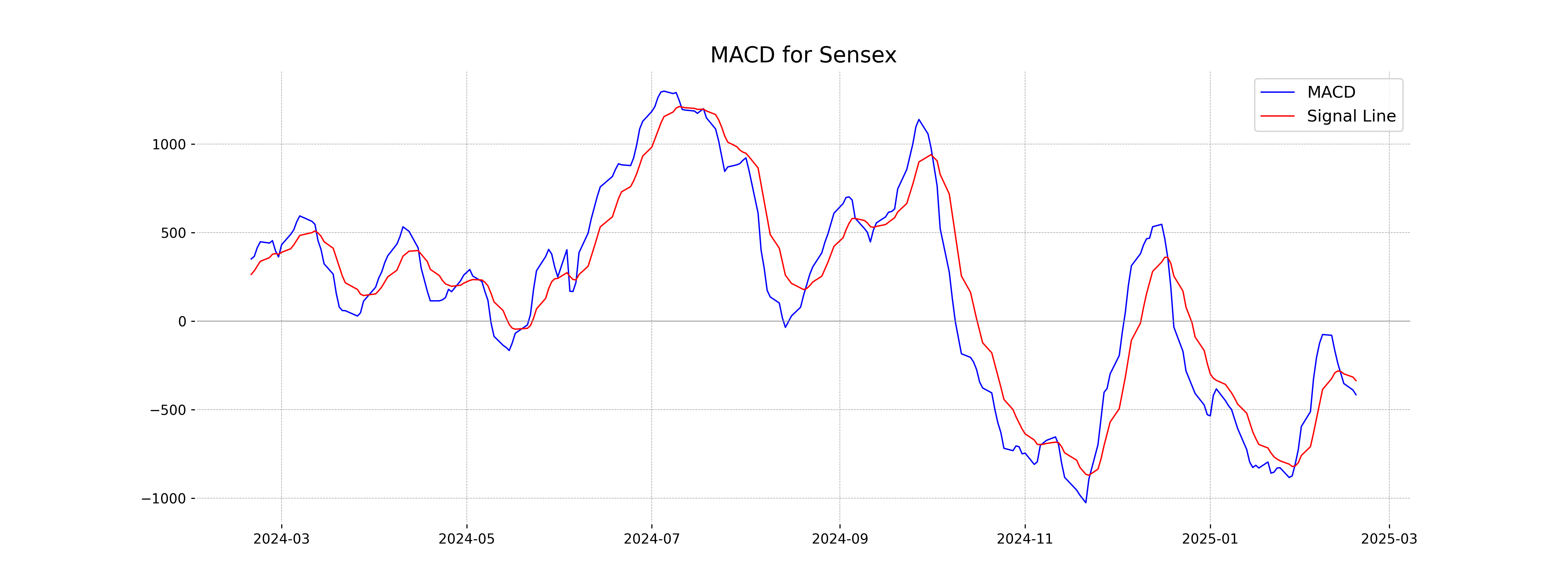 The Sensex is showing a bearish trend, as indicated by the negative MACD value of -415.54, which is below its signal line at -335.95. This suggests that the selling pressure currently outweighs the buying pressure.