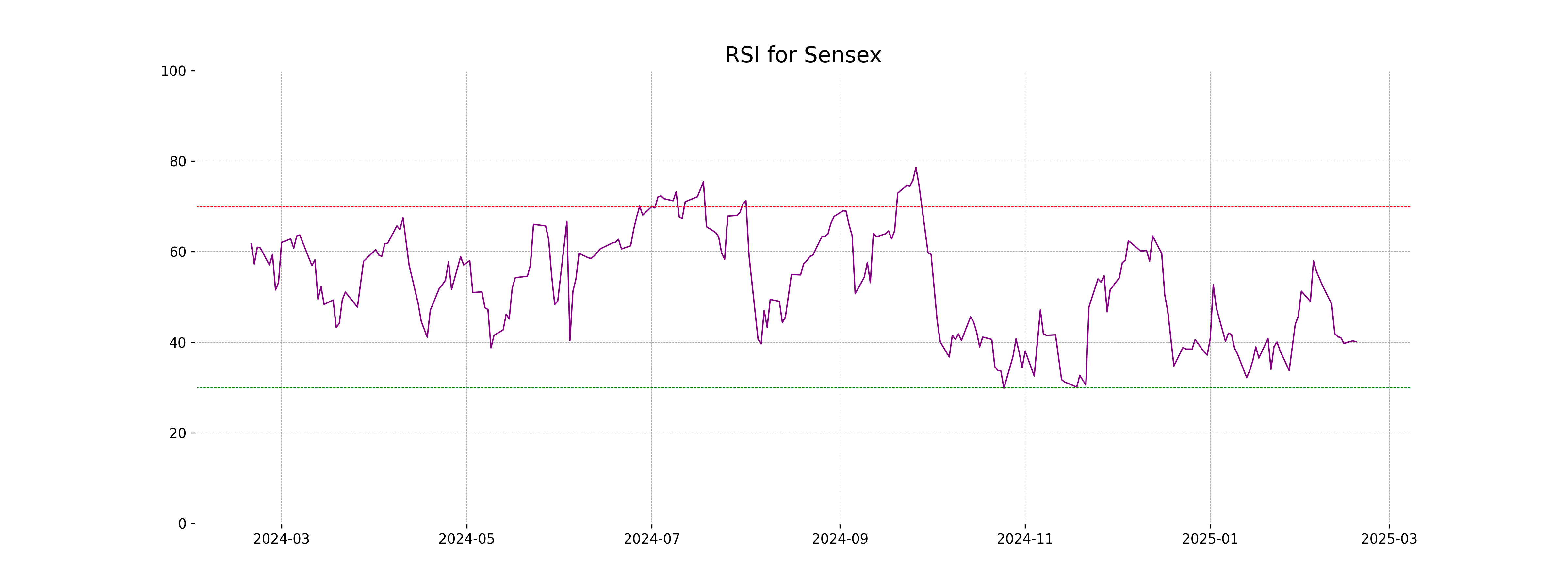 Based on the given data, the RSI for Sensex is 40.10, which indicates that the market is nearing oversold conditions, as it is below the neutral line of 50. This might suggest a potential buying opportunity if the market starts to recover or show strength.